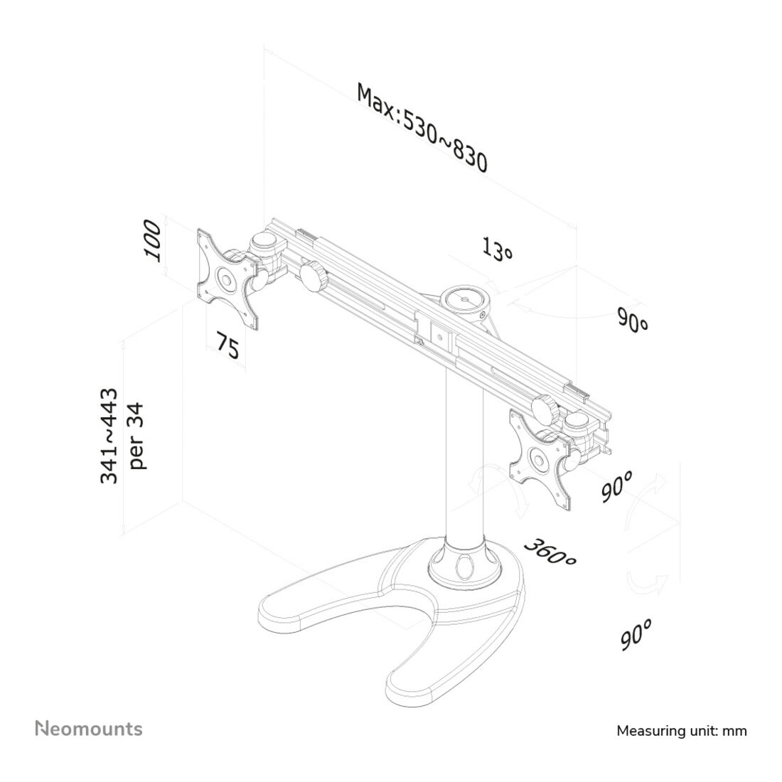 Neomounts FPMA-D700DD Supporto per monitor 19-30″. Montaggio: Indipendente/passacavo, Capienza minima dimensioni dello schermo: 48,3 cm (19″), Capienza massima dimensioni dello schermo: 76,2 cm (30″), Compatibilità interfaccia di montaggio (min): 75 x 75 mm, Compatibilità interfaccia di montaggio (max): 100 x 100 mm. Regolazione altezza, Inclinazione: 0 – 180°. Colore del prodotto: Nero