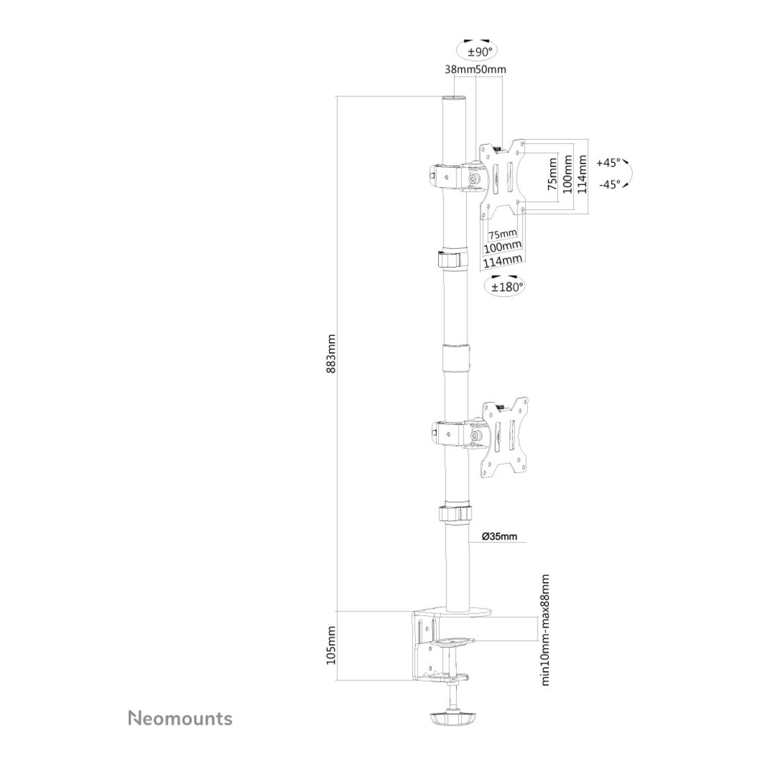 Neomounts FPMA-D550DVBLACK Braccio per monitor 10-32″ – installazione verticale. Montaggio: Morsetto/occhiello, Capienza minima dimensioni dello schermo: 25,4 cm (10″), Capienza massima dimensioni dello schermo: 81,3 cm (32″), Compatibilità interfaccia di montaggio (min): 75 x 75 mm, Compatibilità interfaccia di montaggio (max): 100 x 100 mm. Regolazione altezza, Inclinazione: 0 – 90°. Colore del prodotto: Nero