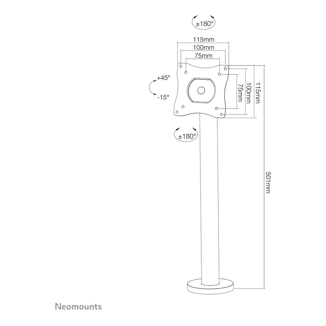 Neomounts NS-DPOS100BLACK Supporto per monitor 10-32″ – a fissaggio. Montaggio: Bullone di ancoraggio, Peso massimo (capacità): 15 kg, Capienza minima dimensioni dello schermo: 25,4 cm (10″), Capienza massima dimensioni dello schermo: 81,3 cm (32″), Compatibilità interfaccia di montaggio (min): 75 x 75 mm, Compatibilità interfaccia di montaggio (max): 100 x 100 mm. Regolazione altezza, Inclinazione: -15 – 45°. Colore del prodotto: Nero