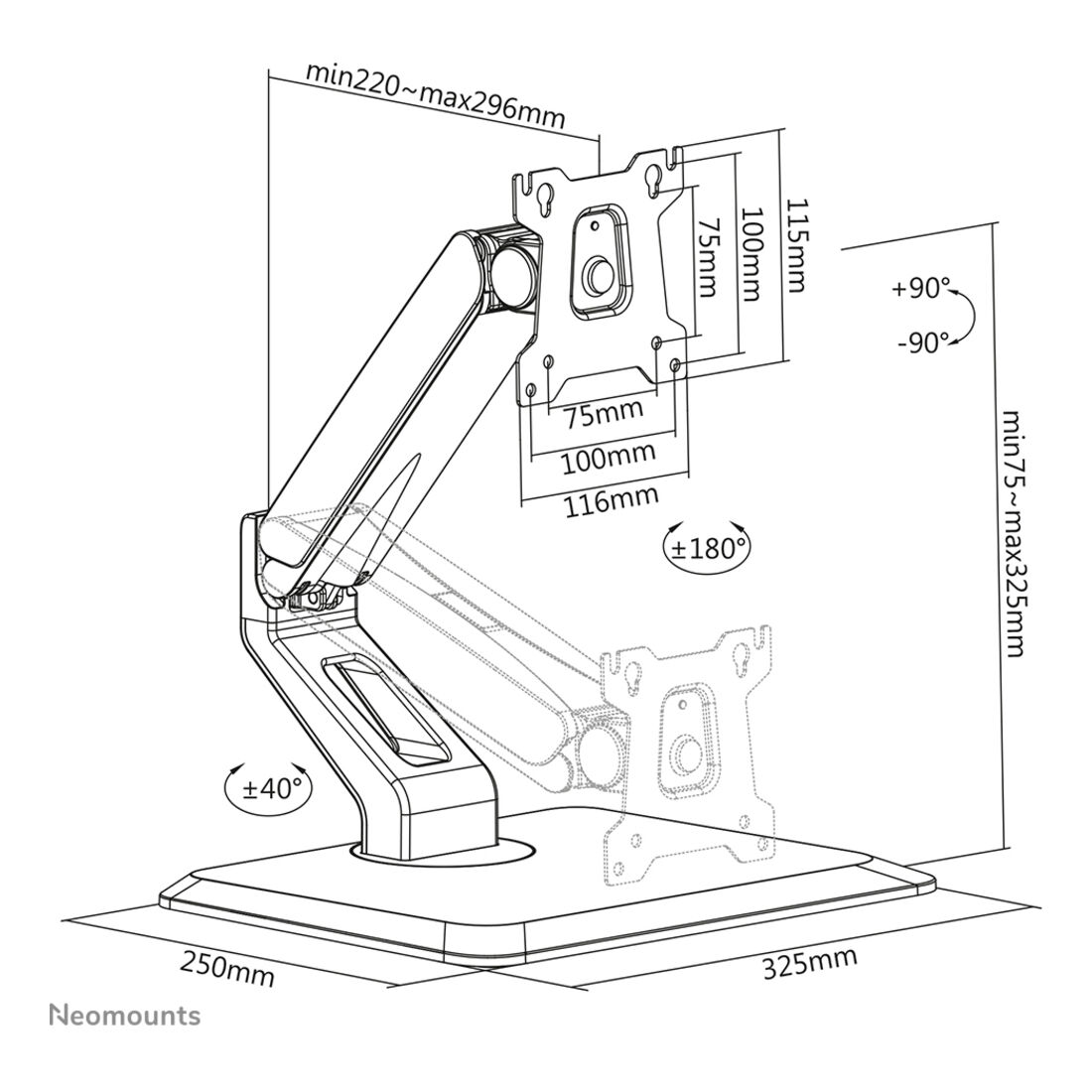Neomounts FPMA-D885BLACK Supporto per monitor 15-32″ – molla a gas. Montaggio: Libera installazione, Peso massimo (capacità): 10 kg, Capienza minima dimensioni dello schermo: 38,1 cm (15″), Capienza massima dimensioni dello schermo: 81,3 cm (32″), Compatibilità interfaccia di montaggio (min): 75 x 75 mm, Compatibilità interfaccia di montaggio (max): 100 x 100 mm. Regolazione altezza, Inclinazione: 0 – 180°. Colore del prodotto: Nero