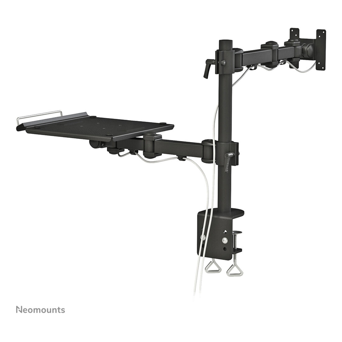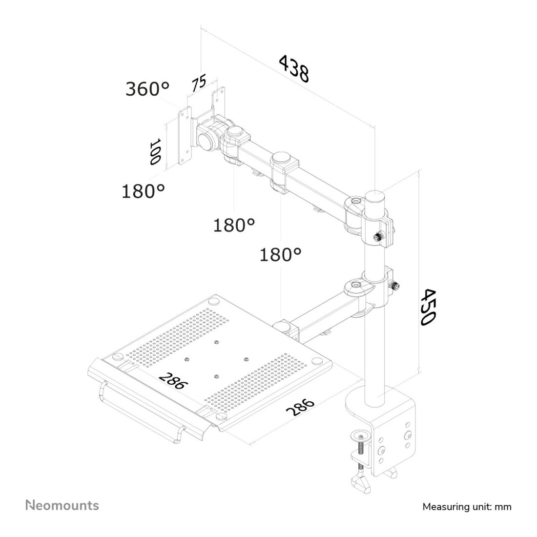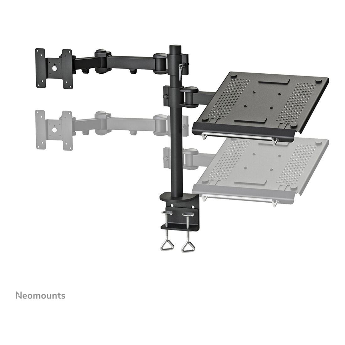 Neomounts FPMA-D960NOTEBOOK Braccio per monitor con supporto per laptop 10-27″. Montaggio: Morsa, Peso massimo (capacità): 10 kg, Capienza minima dimensioni dello schermo: 25,4 cm (10″), Capienza massima dimensioni dello schermo: 68,6 cm (27″), Compatibilità interfaccia di montaggio (min): 75 x 75 mm, Compatibilità interfaccia di montaggio (max): 100 x 100 mm. Regolazione altezza, Inclinazione: 0 – 180°. Colore del prodotto: Nero