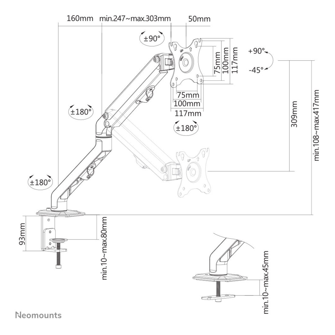 Neomounts FPMA-D650BLACK Braccio per monitor 17-27″ – molla elicoidale. Montaggio: Morsetto/occhiello, Peso massimo (capacità): 7 kg, Capienza minima dimensioni dello schermo: 43,2 cm (17″), Capienza massima dimensioni dello schermo: 68,6 cm (27″), Compatibilità interfaccia di montaggio (min): 75 x 75 mm, Compatibilità interfaccia di montaggio (max): 100 x 100 mm. Regolazione altezza, Inclinazione: 0 – 130°. Colore del prodotto: Nero