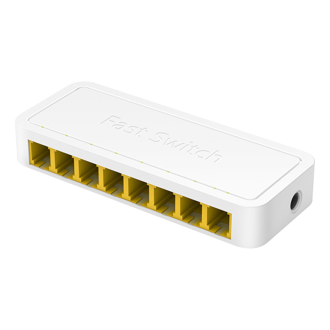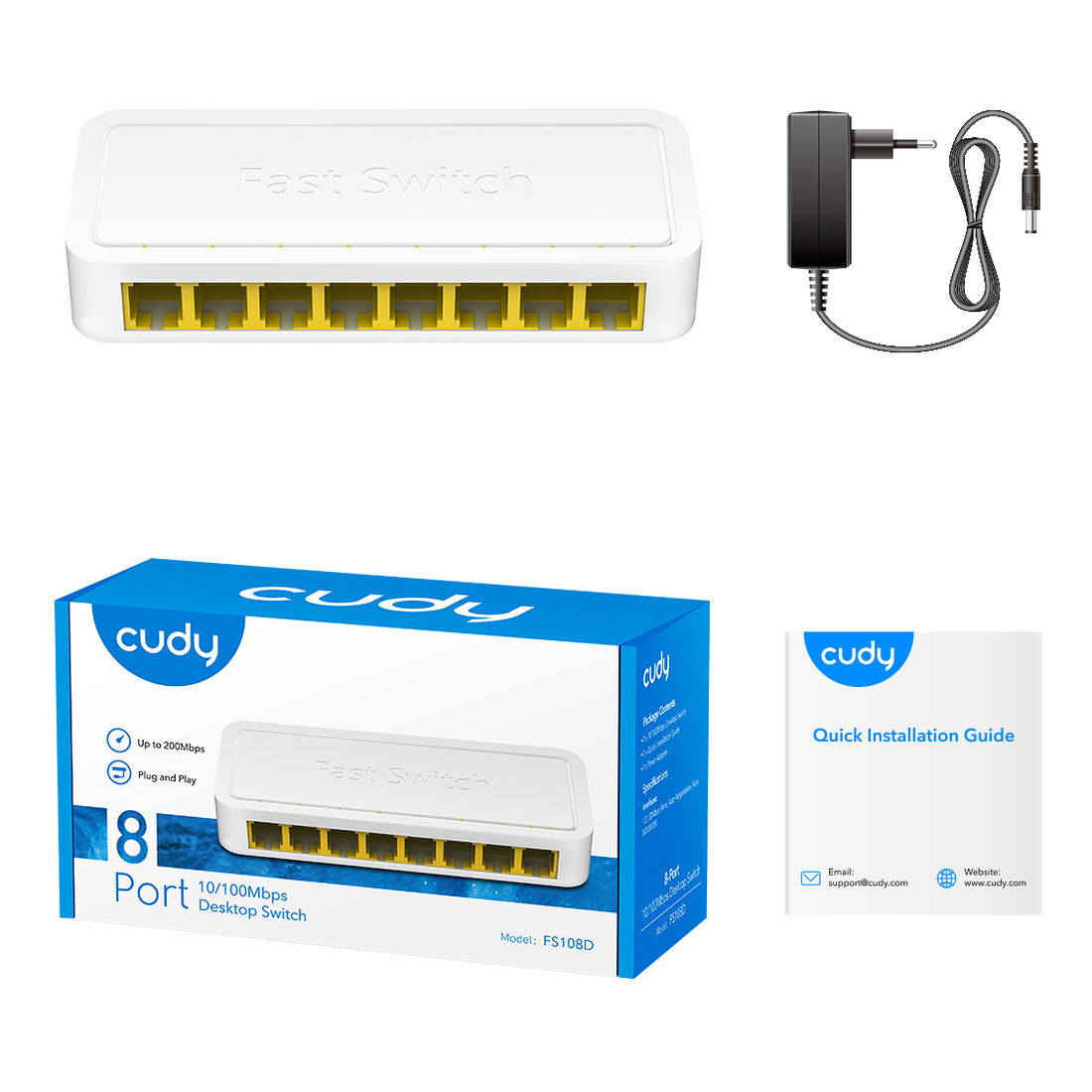 Cudy FS108D. Tipo di porte RJ-45: Fast Ethernet (10/100), Quantità di porte RJ-45: 8. Full duplex. Dimensioni tavola MAC: 2 voci, Capacità di commutazione: 1,6 Gbit/s. Standard di rete: IEEE 802.3, IEEE 802.3u, IEEE 802.3x. Voltaggio input DC: 5 V