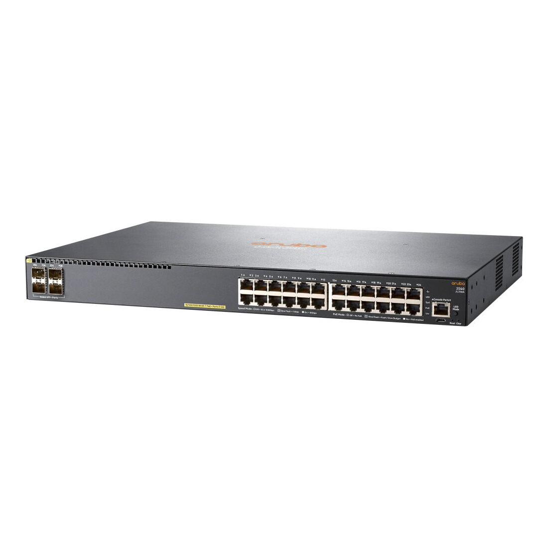 HPE Aruba Networking Aruba 2540 24G PoE+ 4SFP+. Tipo interruttore: Gestito, Livello del commutatore: L2. Tipo di porte RJ-45: Gigabit Ethernet (10/100/1000), Quantità di porte RJ-45: 24, Console port: RJ-45. Full duplex. Dimensioni tavola MAC: 16384 voci, Capacità di commutazione: 128 Gbit/s. Standard di rete: IEEE 802.1AX, IEEE 802.1D, IEEE 802.1Q, IEEE 802.1p, IEEE 802.1s, IEEE 802.1v, IEEE 802.1w, IEEE…. Supporto Power over Ethernet (PoE). Montaggio rack, Fattore di forma: 1U
