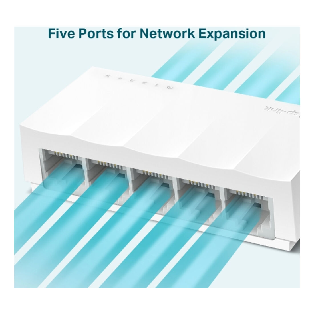 TP-Link LS1005. Tipo interruttore: Non gestito. Tipo di porte RJ-45: Fast Ethernet (10/100), Quantità di porte RJ-45: 5. Dimensioni tavola MAC: 2000 voci, Capacità di commutazione: 1 Gbit/s. Standard di rete: IEEE 802.3i, IEEE 802.3u, IEEE 802.3x. Voltaggio input DC: 5 V