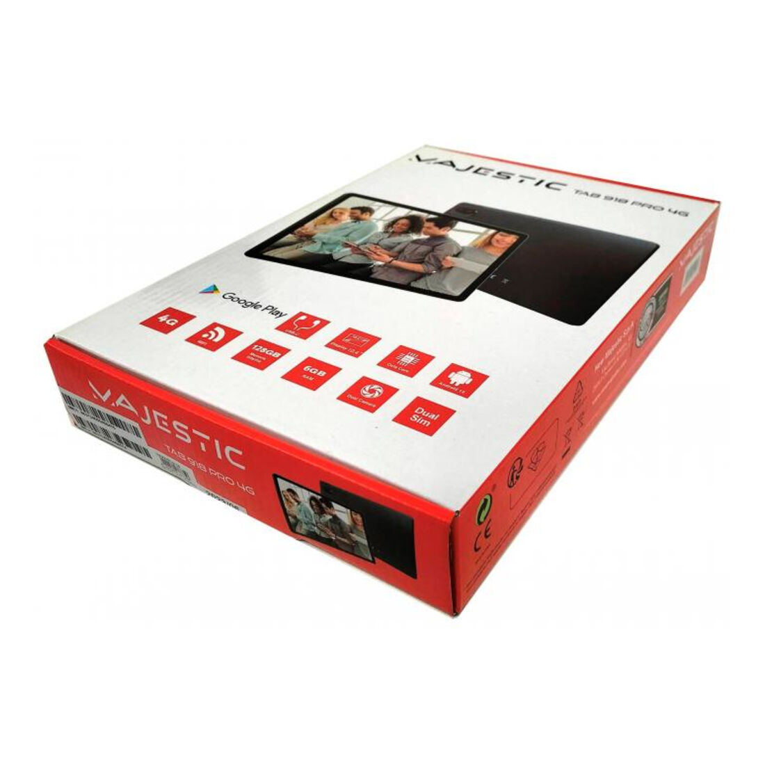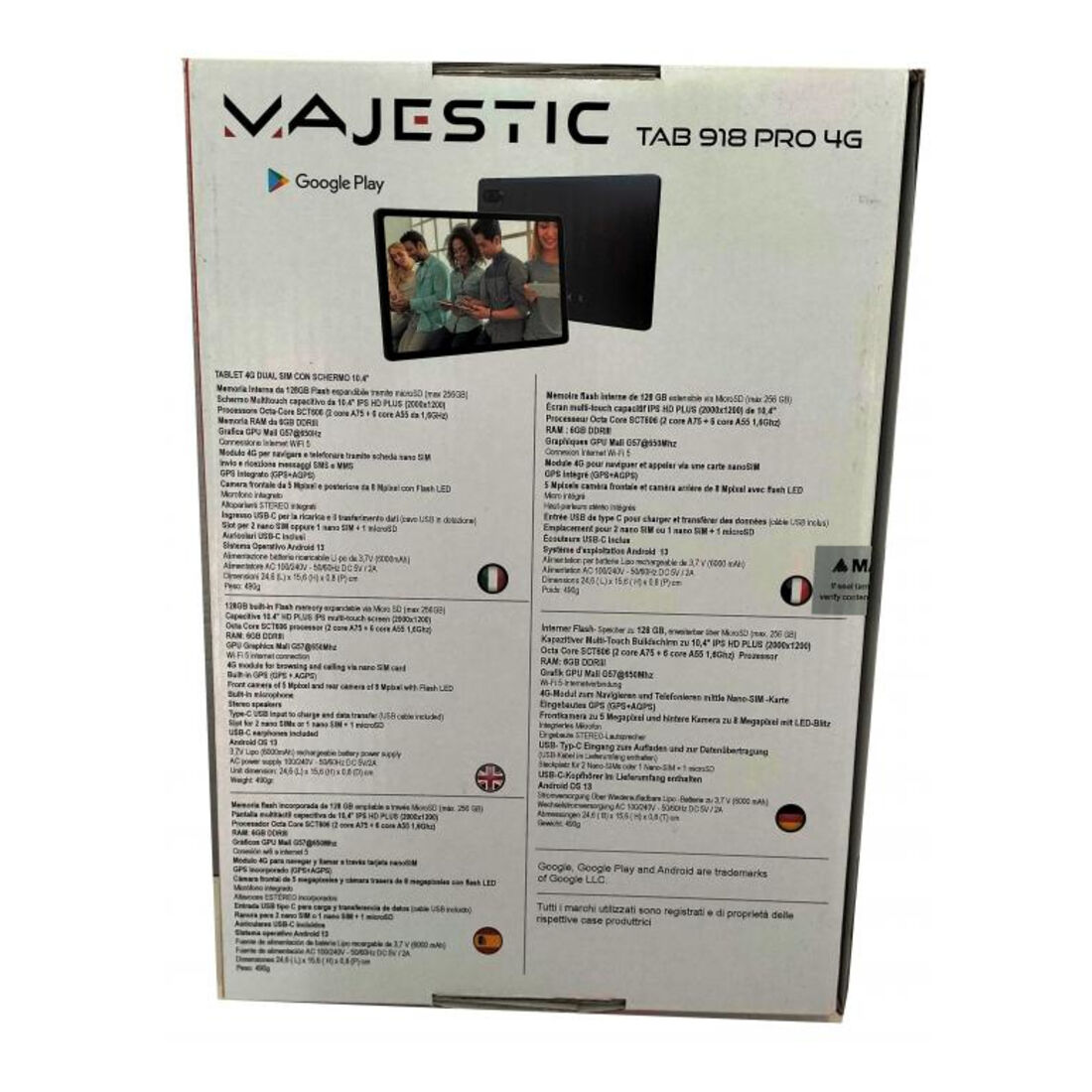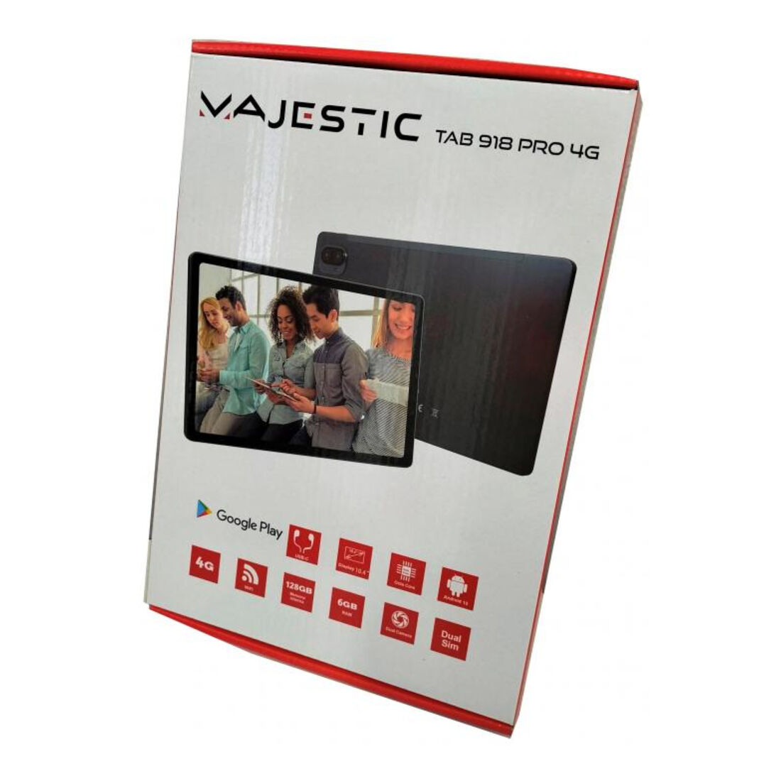 New Majestic TAB 918 PRO 4G. Dimensioni diagonale schermo: 26,4 cm (10.4″), Risoluzione del display: 2000 x 1200 Pixel. Capacità memoria interna: 128 GB. Frequenza del processore: 1,6 GHz, Modello del processore: T606. RAM installata: 6 GB. Risoluzione fotocamera posteriore (numerico): 8 MP, Tipo di fotocamera posteriore: Doppia fotocamera, Risoluzione fotocamera frontale (numerico): 5 MP. Wi-Fi standard: Wi-Fi 5 (802.11ac). Assistenza funzione GPS (A-GPS). Lettore di schede integrato. Peso: 490 g. Sistema operativo incluso: Android 13. Colore del prodotto: Nero