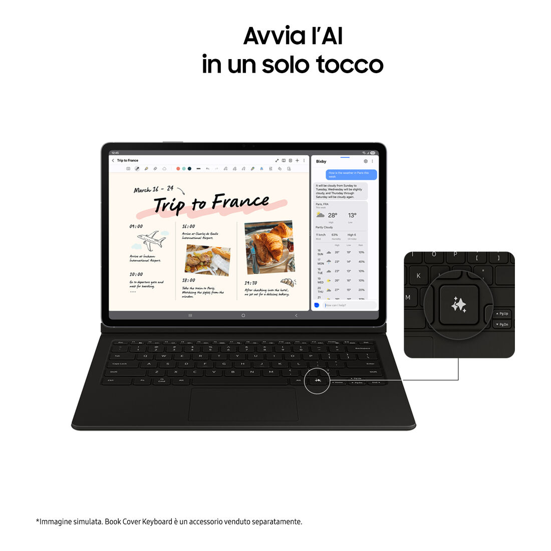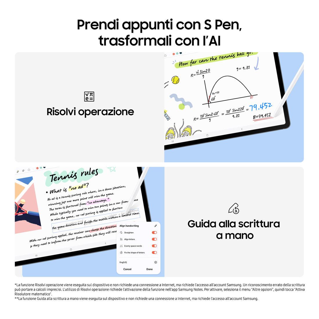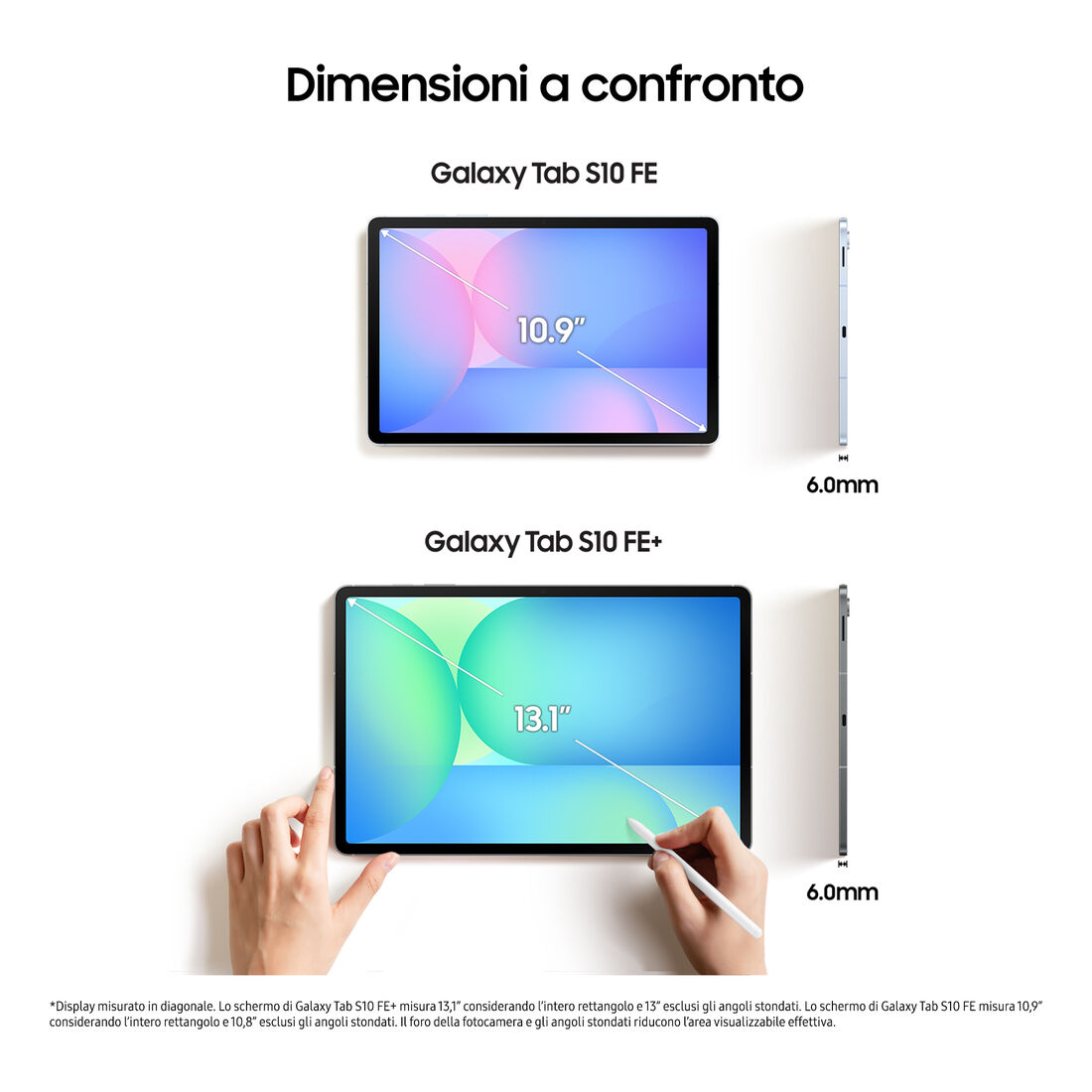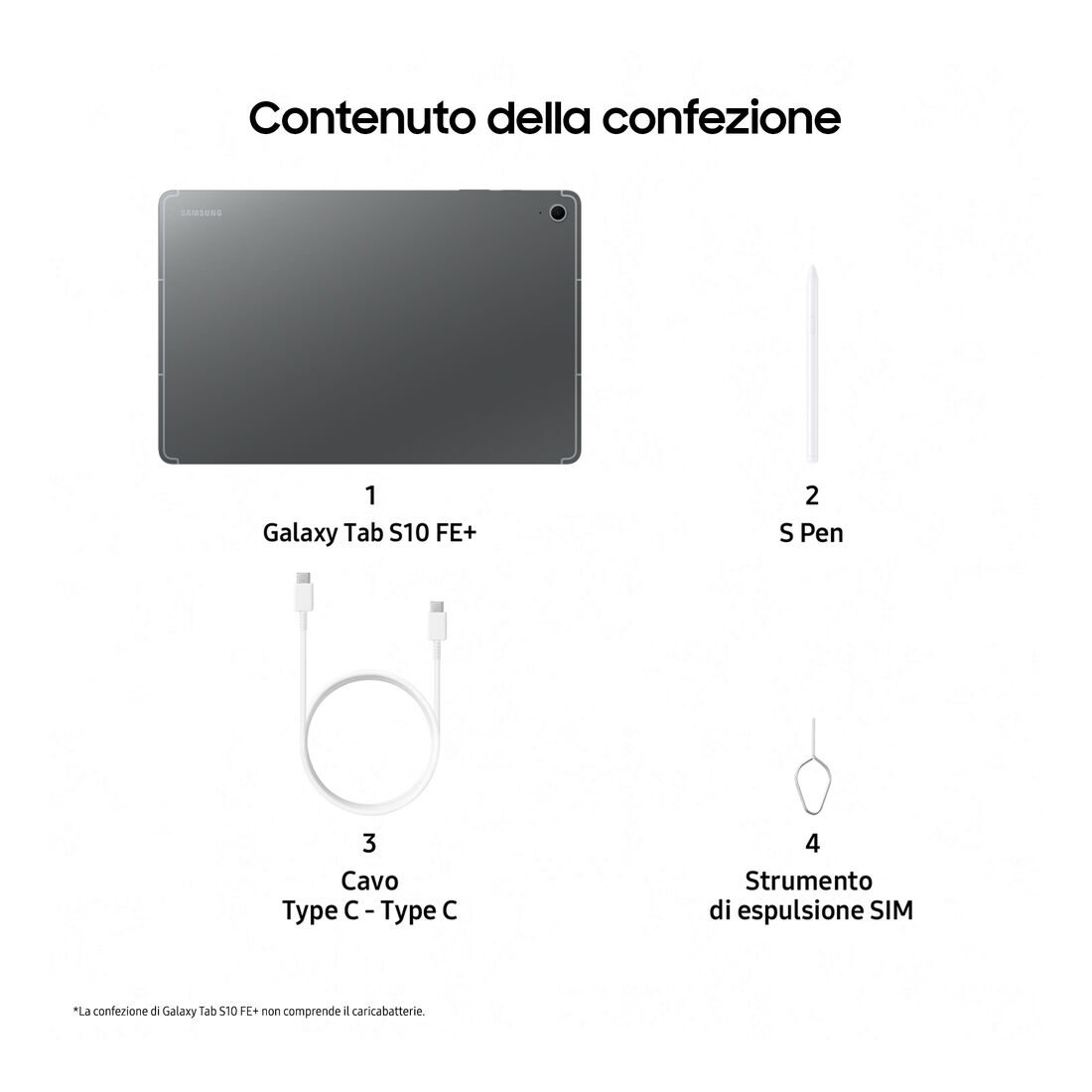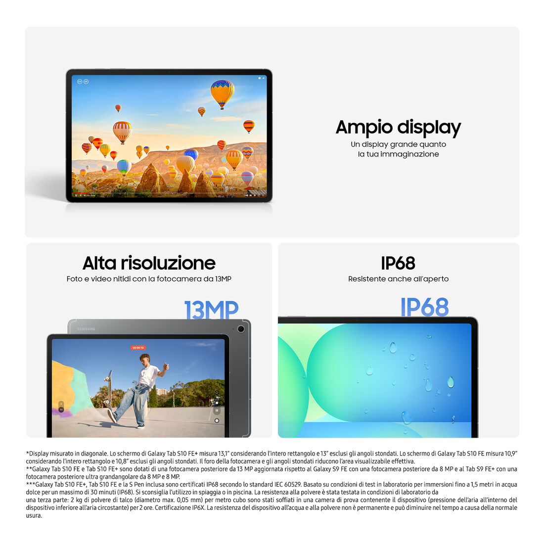 Samsung Galaxy Tab S10 FE+, Android Tablet, Display 13.1″LCD, Wifi, RAM 8GB, 128GB, 10.090 mAh, S Pen, Android 15, IP68, Gray. Dimensioni diagonale schermo: 33,3 cm (13.1″), Risoluzione del display: 2880 x 1800 Pixel. Capacità memoria interna: 128 GB. Frequenza del processore: 1,9 GHz, Famiglia processore: Samsung Exynos, Modello del processore: 1580. RAM installata: 8 GB. Risoluzione fotocamera posteriore (numerico): 13 MP, Risoluzione fotocamera frontale (numerico): 12 MP. Wi-Fi standard: Wi-Fi 6 (802.11ax). Assistenza funzione GPS (A-GPS). Lettore di schede integrato. Peso: 664 g. Sistema operativo incluso: Android 15. Colore del prodotto: Grigio
