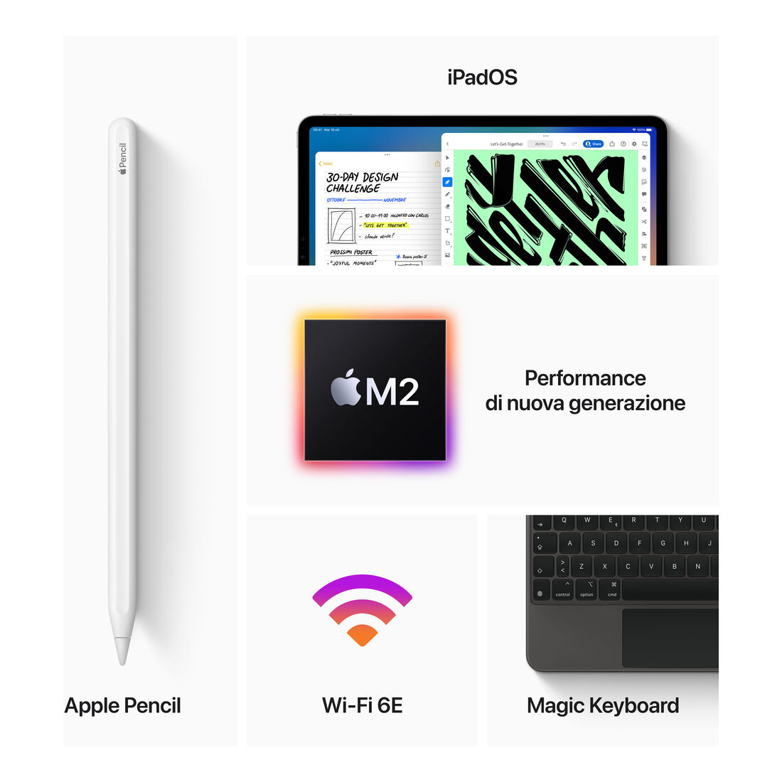 iPad Pro, 12.9″ mini-LED IPS, 2732×2048, Apple M2, 8GB RAM, 128GB, 802.11ax Wi‑Fi 6E, Bluetooth 5.3, 12MP + 12MP, LiDAR, iPadOS 16
