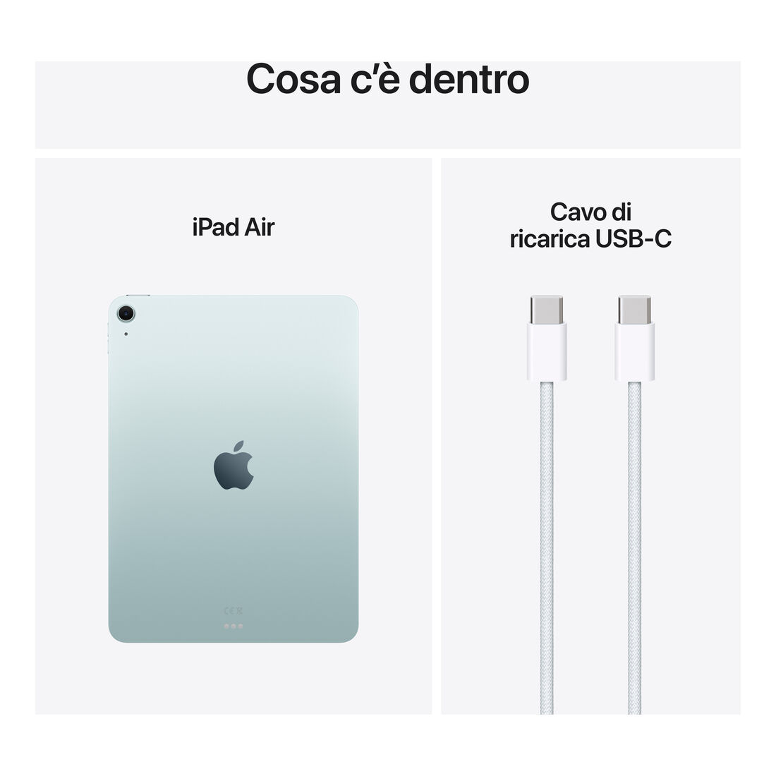 Apple iPad Air 11” Wi-Fi 128GB Blu. Dimensioni diagonale schermo: 27,9 cm (11″), Risoluzione del display: 2360 x 1640 Pixel, Tecnologia display: LED. Capacità memoria interna: 128 GB. Famiglia processore: Apple M, Modello del processore: M3. RAM installata: 8 GB. Risoluzione fotocamera posteriore (numerico): 12 MP, Tipo di fotocamera posteriore: Fotocamera singola, Risoluzione fotocamera frontale (numerico): 12 MP, Fotocamera frontale. Wi-Fi standard: Wi-Fi 6E (802.11ax). Peso: 460 g. Sistema operativo incluso: iPadOS 18. Colore del prodotto: Blu