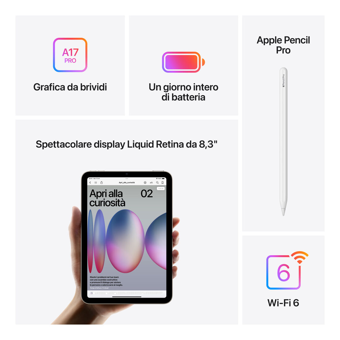 Apple iPad mini Wi-Fi 512GB – Blu. Dimensioni diagonale schermo: 21,1 cm (8.3″), Risoluzione del display: 2266 x 1488 Pixel, Tecnologia display: LED. Capacità memoria interna: 512 GB. Famiglia processore: Apple, Modello del processore: A17 Pro. Risoluzione fotocamera posteriore (numerico): 12 MP, Tipo di fotocamera posteriore: Fotocamera singola, Risoluzione fotocamera frontale (numerico): 12 MP, Fotocamera frontale. Wi-Fi standard: Wi-Fi 6E (802.11ax). Peso: 293 g. Sistema operativo incluso: iPadOS 18. Colore del prodotto: Blu