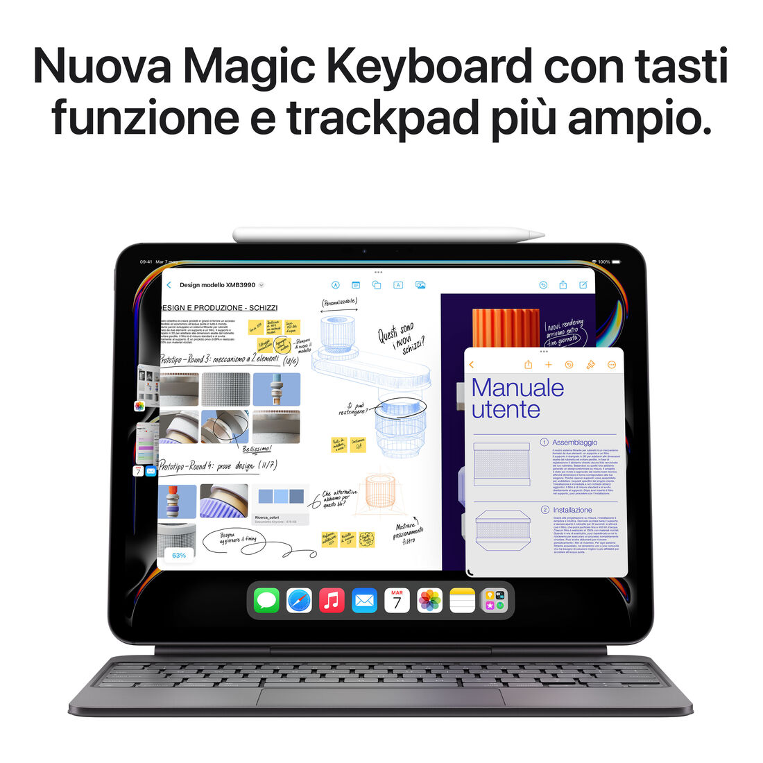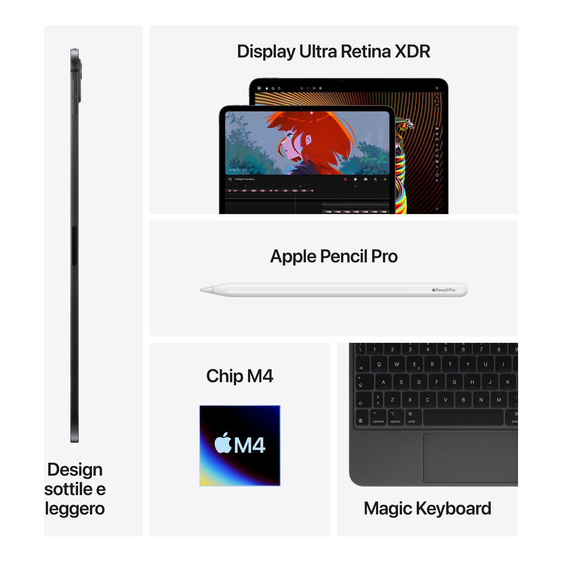 Apple iPad Pro 13” Wi-Fi 2TB Standard glass – Nero Siderale. Dimensioni diagonale schermo: 33 cm (13″), Risoluzione del display: 2752 x 2064 Pixel, Tecnologia display: OLED. Capacità memoria interna: 2 TB. Famiglia processore: Apple M, Modello del processore: M4. RAM installata: 16 GB. Risoluzione fotocamera posteriore (numerico): 12 MP, Tipo di fotocamera posteriore: Doppia fotocamera, Risoluzione fotocamera frontale (numerico): 12 MP, Fotocamera frontale. Wi-Fi standard: Wi-Fi 6E (802.11ax). Peso: 579 g. Sistema operativo incluso: iPadOS 17. Colore del prodotto: Nero