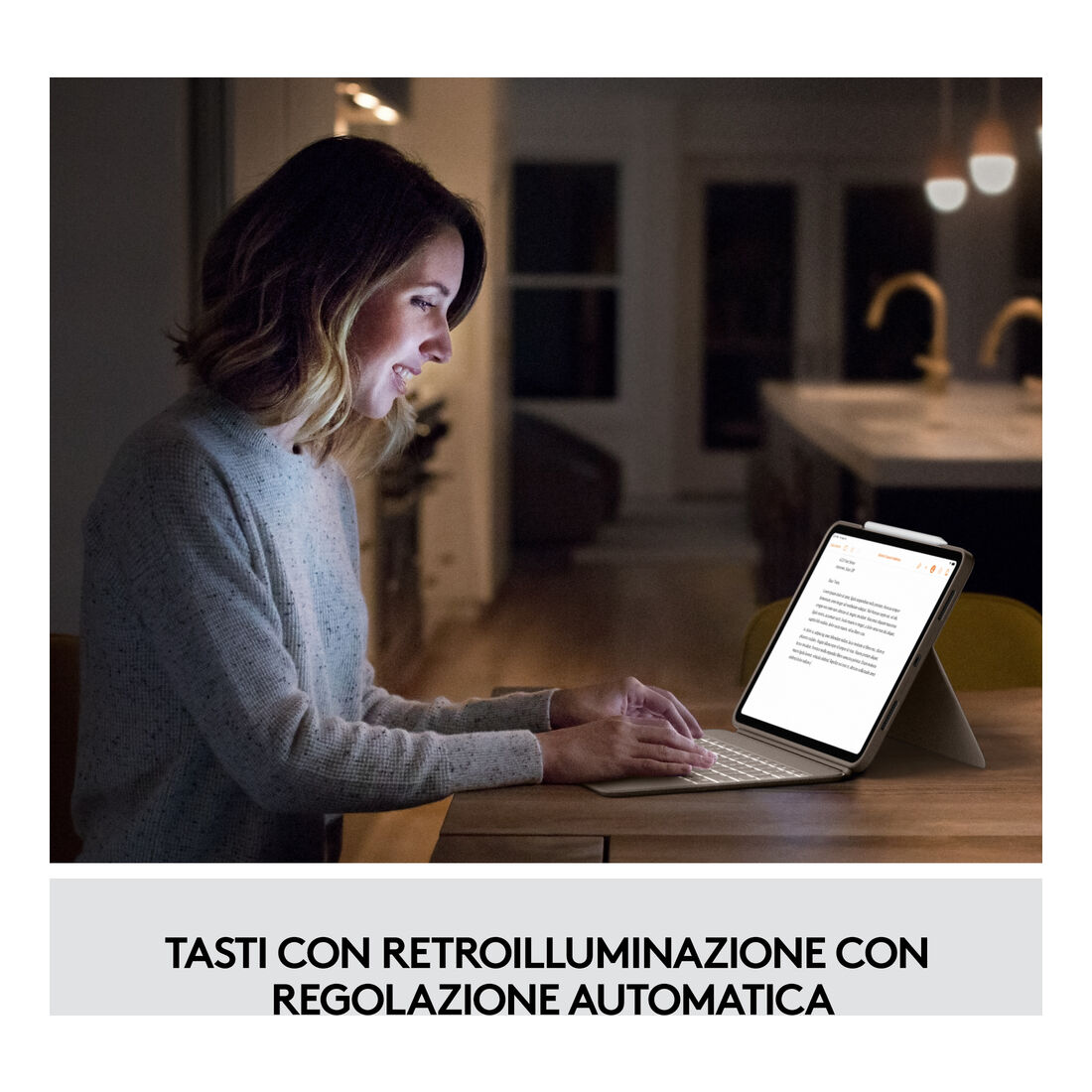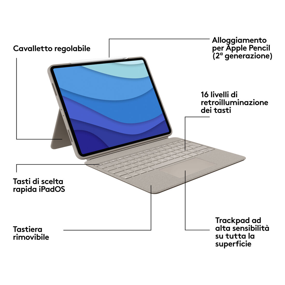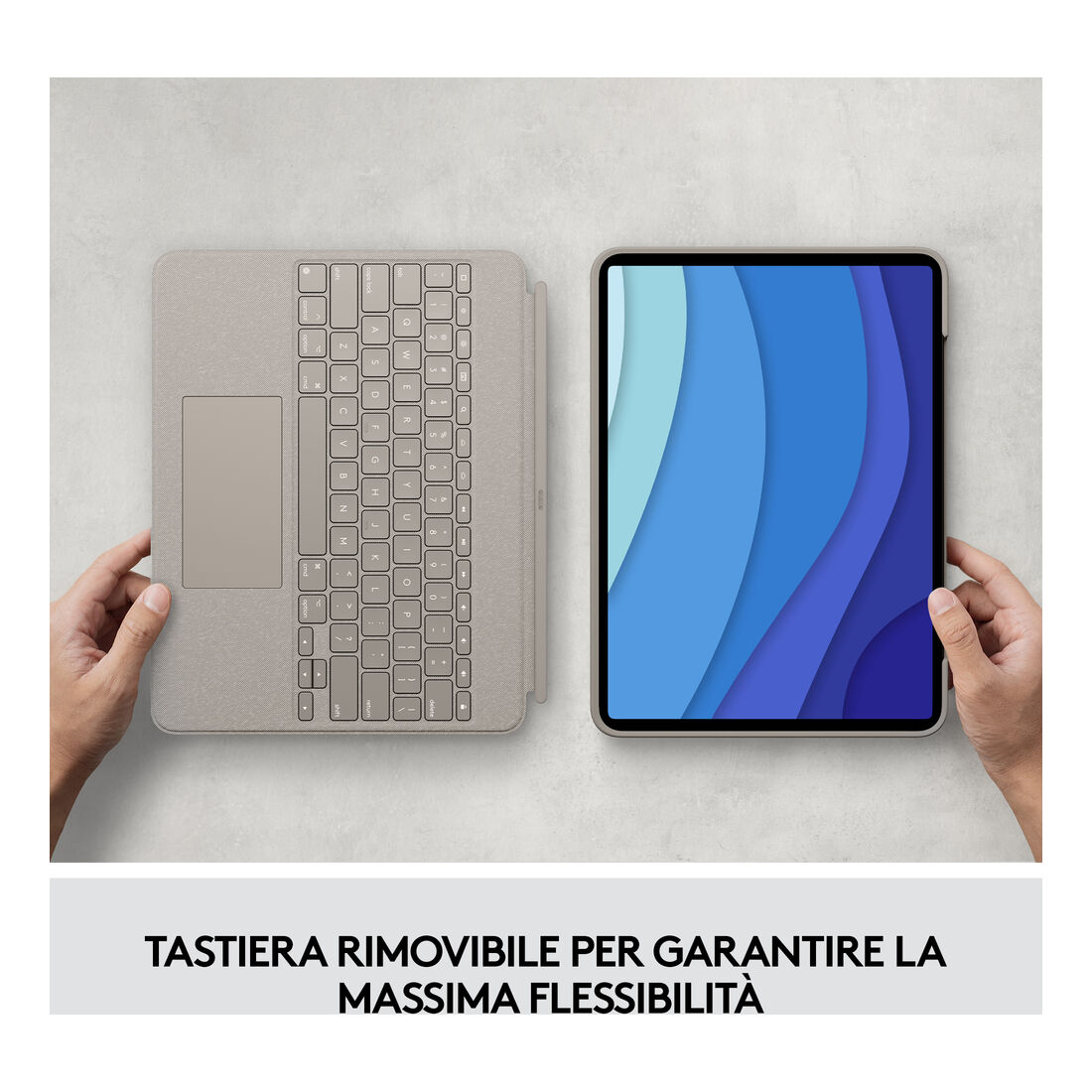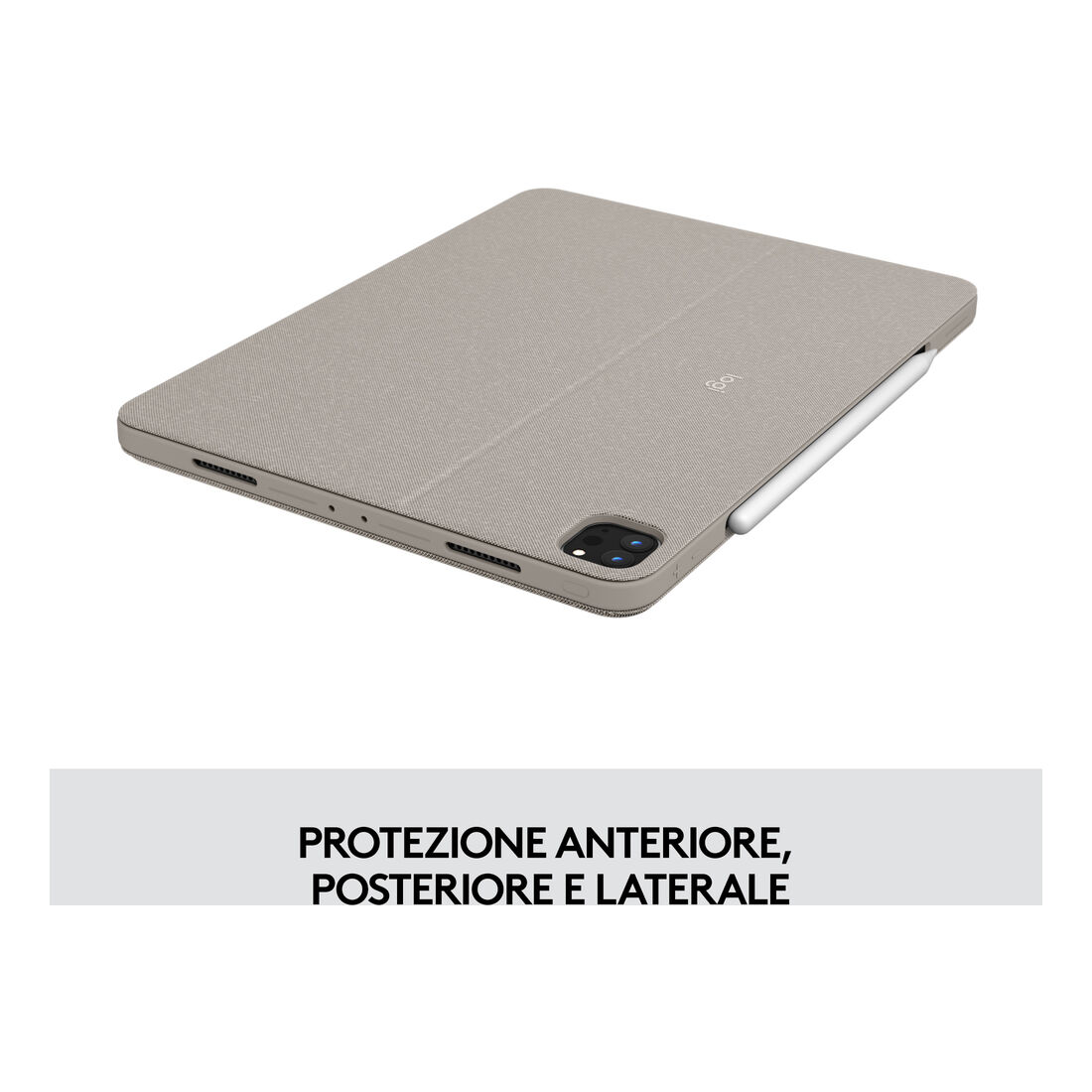 Logitech Combo Touch Custodia con Tastiera per iPad Pro 12,9 pollici (5a gen – 2021) – Tastiera Retroilluminata Rimovibile, Trackpad Click-Anywhere, Smart Connector -Sabbia. Struttura tastiera: QWERTY, Linguaggio tastiera: Italiano, Dispositivo di puntatura: Trackpad. Compatibilità marca: Apple, Compatibilità: {loc-value}, Colore del prodotto: Sabbia. Tecnologia di connessione: Docking, Interfaccia dispositivo: Smart Connector. Alimentazione: Dock. Sistema operativo mobile supportato: iPadOS