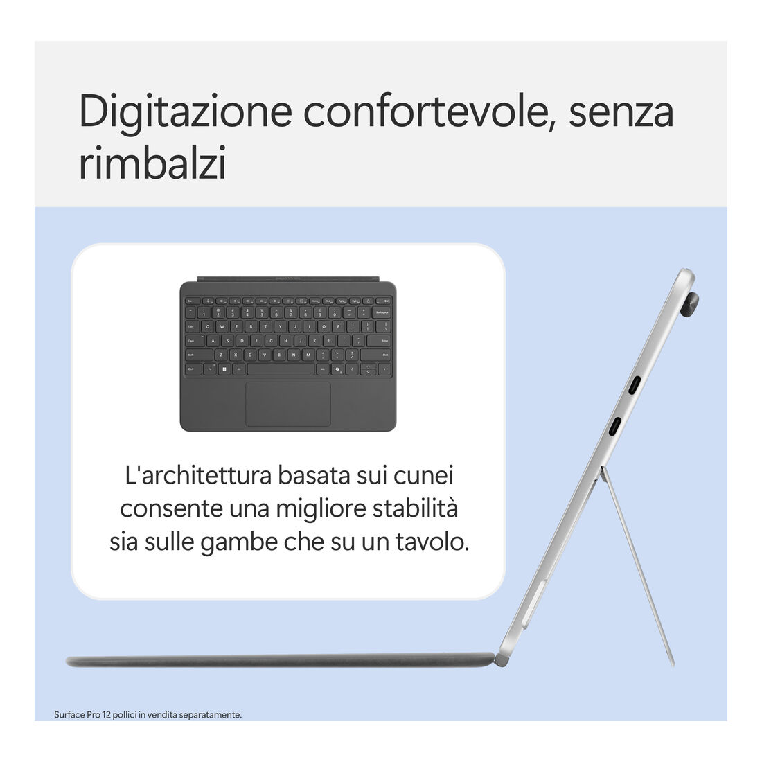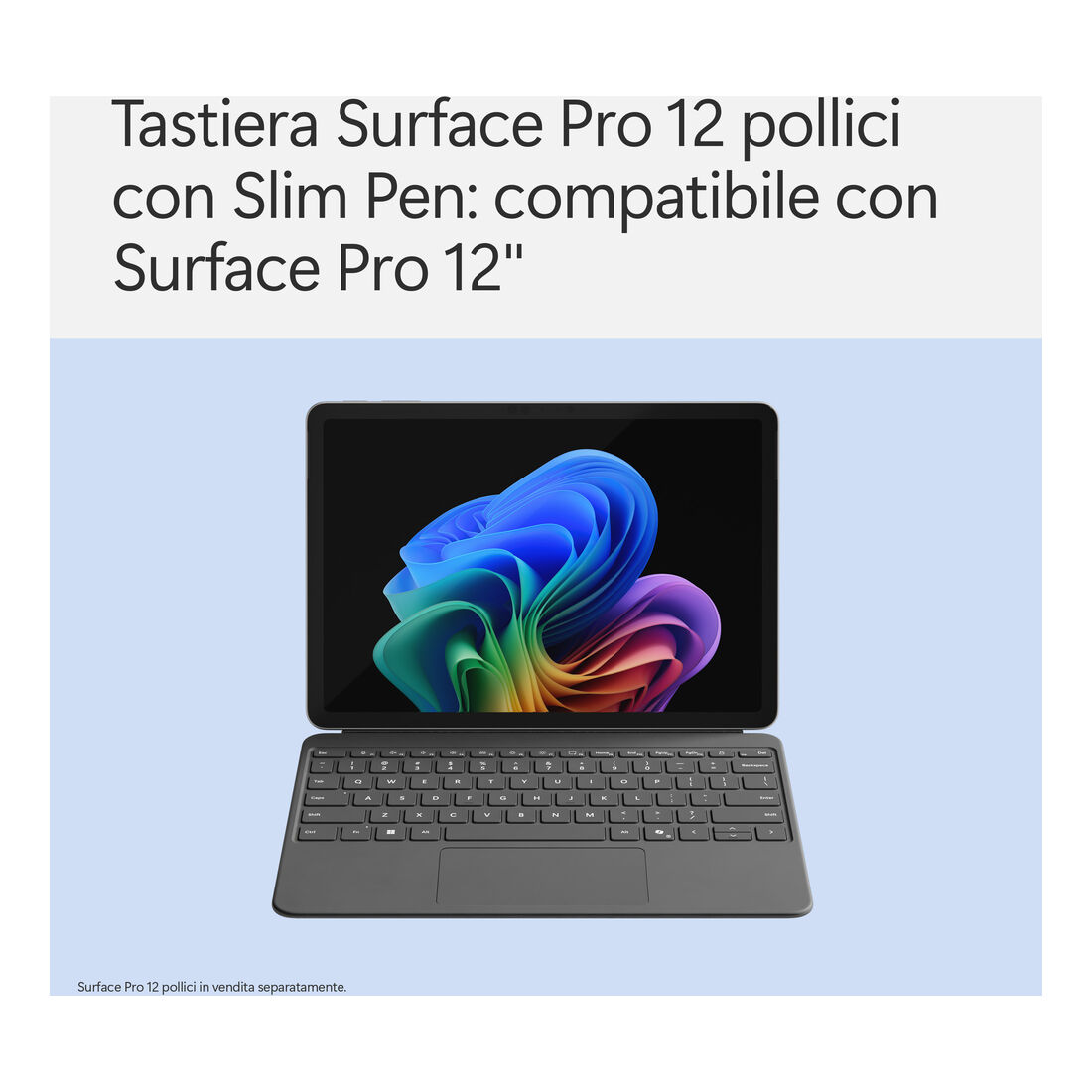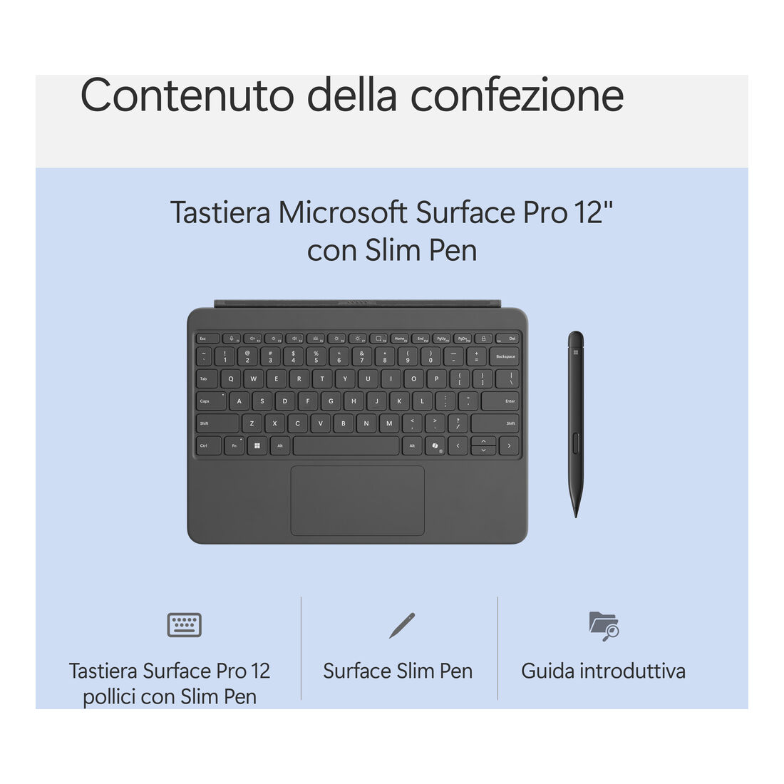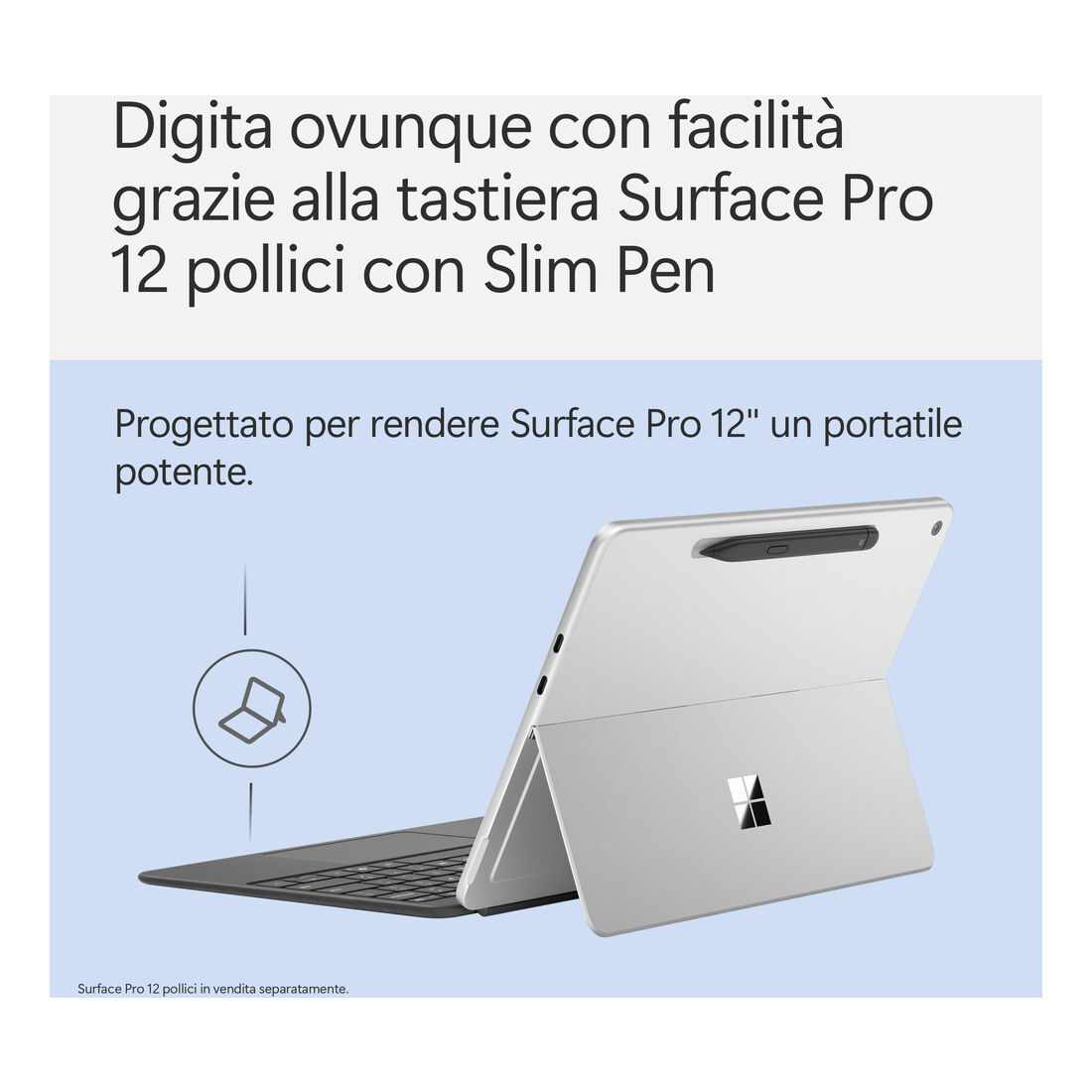 Microsoft Tastiera Surface Pro 12″ con Slim Pen – Ardesia. Struttura tastiera: QWERTY, Linguaggio tastiera: Italiano, Dispositivo di puntatura: Touchpad. Compatibilità marca: Microsoft, Compatibilità: Surface Pro 12, Colore del prodotto: Grigio. Tecnologia di connessione: Docking. Alimentazione: Dock. Larghezza: 192 mm, Profondità: 276 mm, Altezza: 6,8 mm