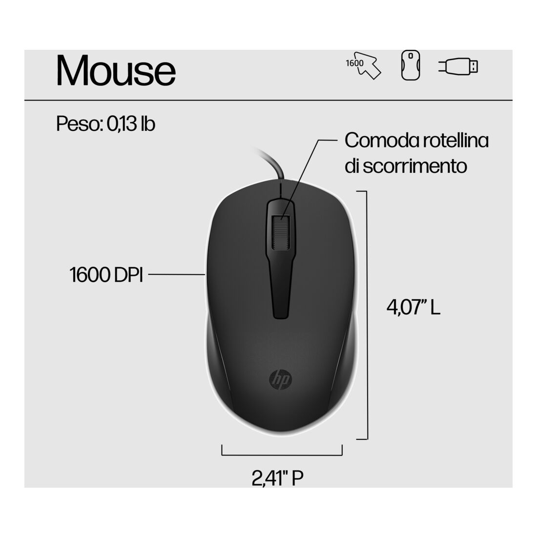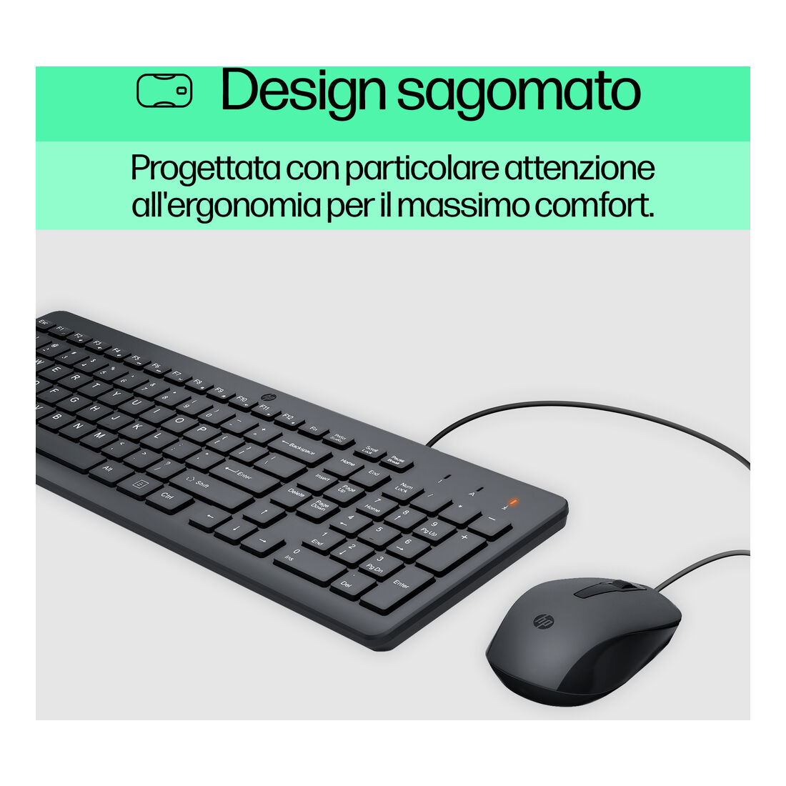 HP Tastiera e mouse 150 Wired. Fattore di forma tastiera: Full-size (100%), Tecnologia di connessione: Cablato, Interfaccia dispositivo: USB, Interruttore a chiave per tastiera: Interruttore a chiave a membrana. Colore del prodotto: Nero. Mouse incluso