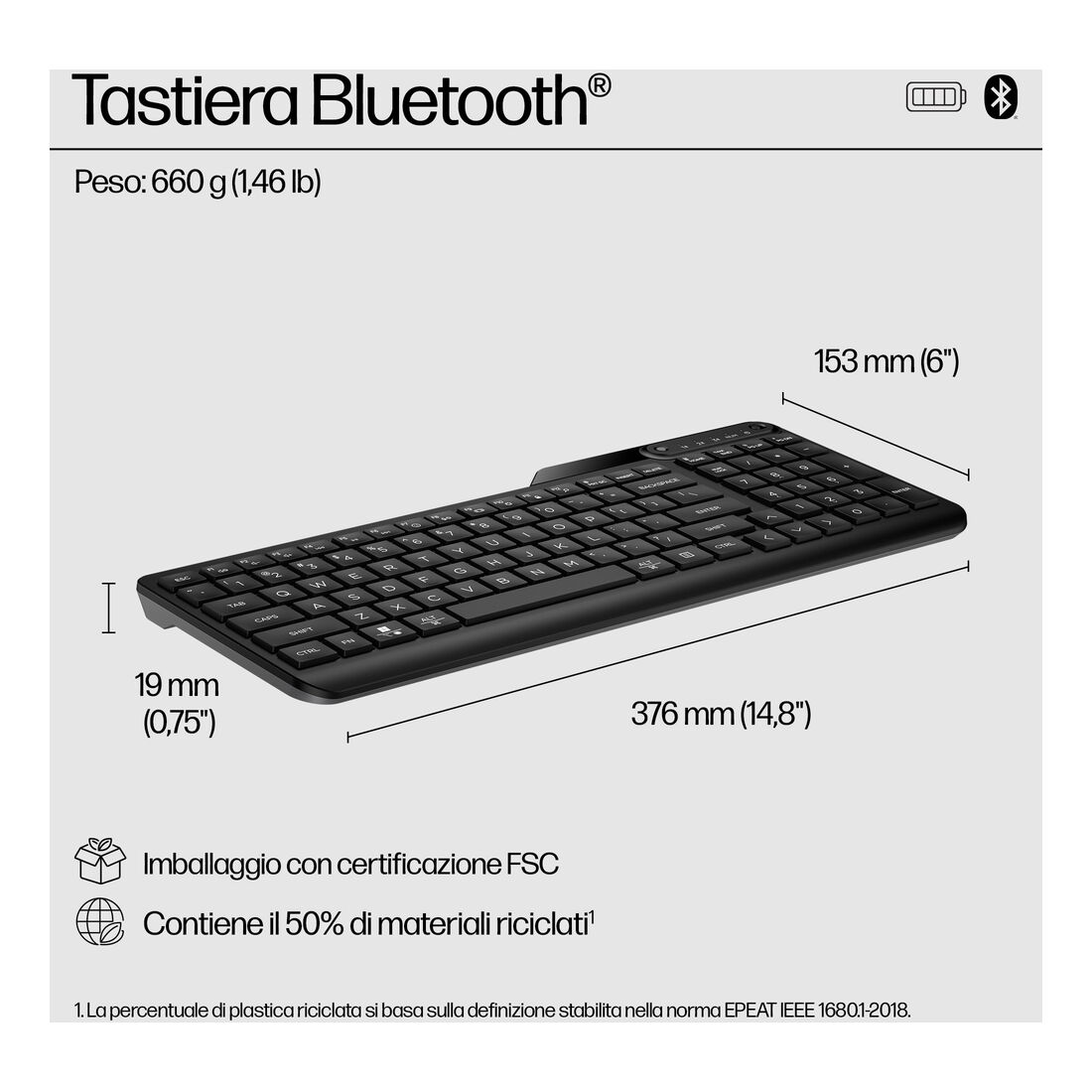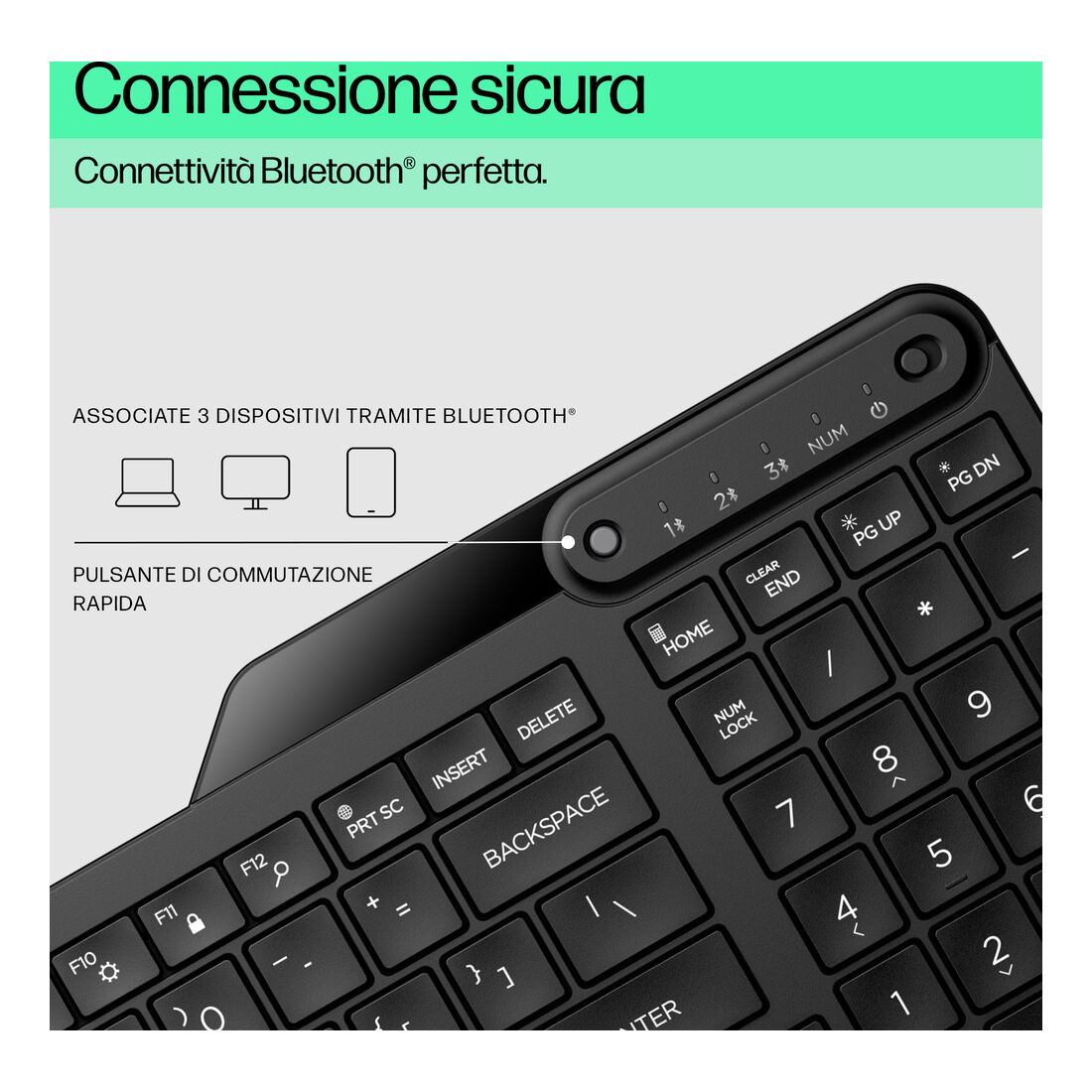 HP Tastiera Bluetooth multi-dispositivo 460. Tecnologia di connessione: Wireless, Interfaccia dispositivo: Bluetooth, Utilizzo raccomandato: Casa. Colore del prodotto: Nero