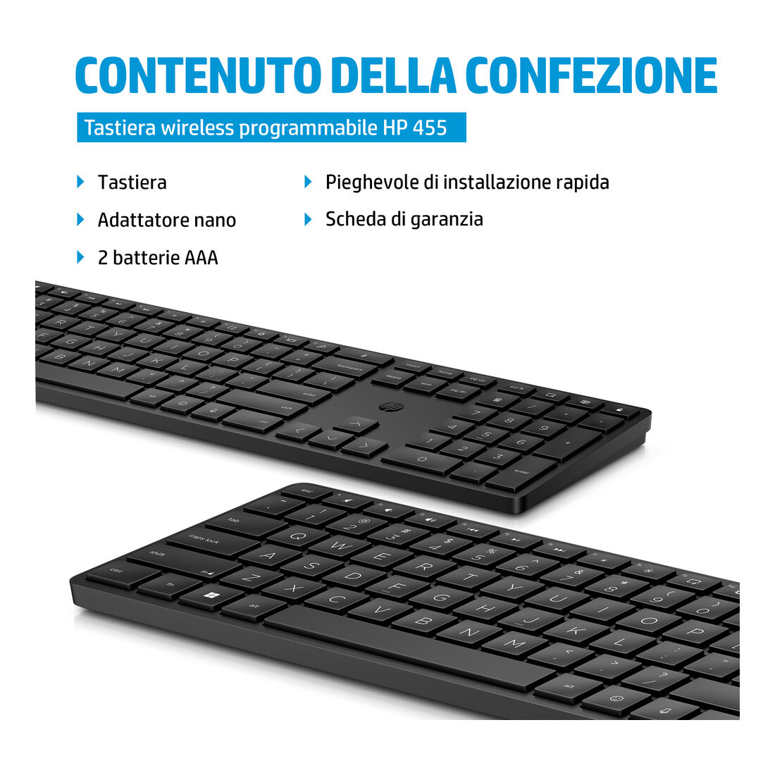 HP Tastiera wireless programmabile 455. Fattore di forma tastiera: Full-size (100%), Tecnologia di connessione: Wireless, Interfaccia dispositivo: RF Wireless, Interruttore a chiave per tastiera: Interruttore a chiave a membrana, Utilizzo raccomandato: Casa. Colore del prodotto: Nero