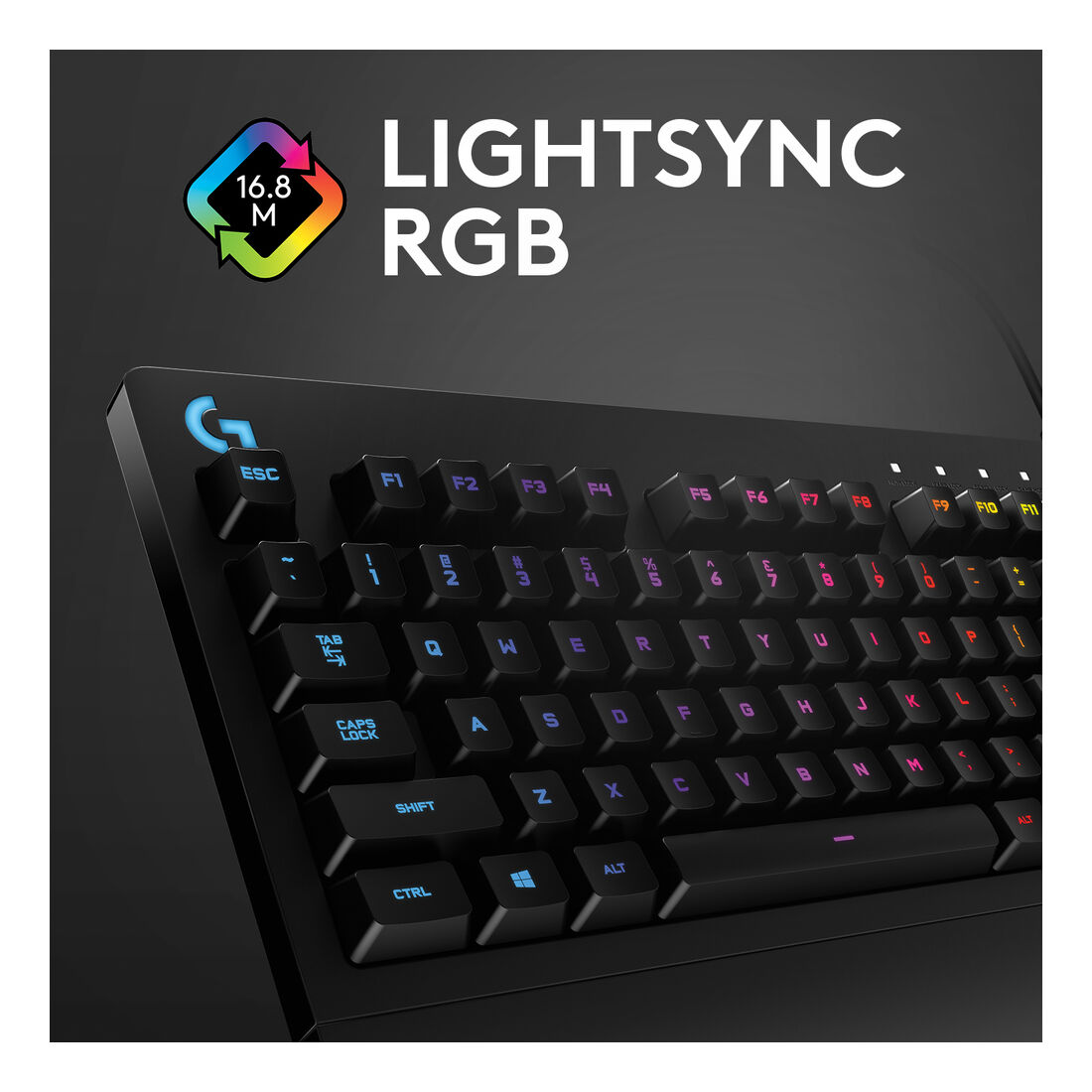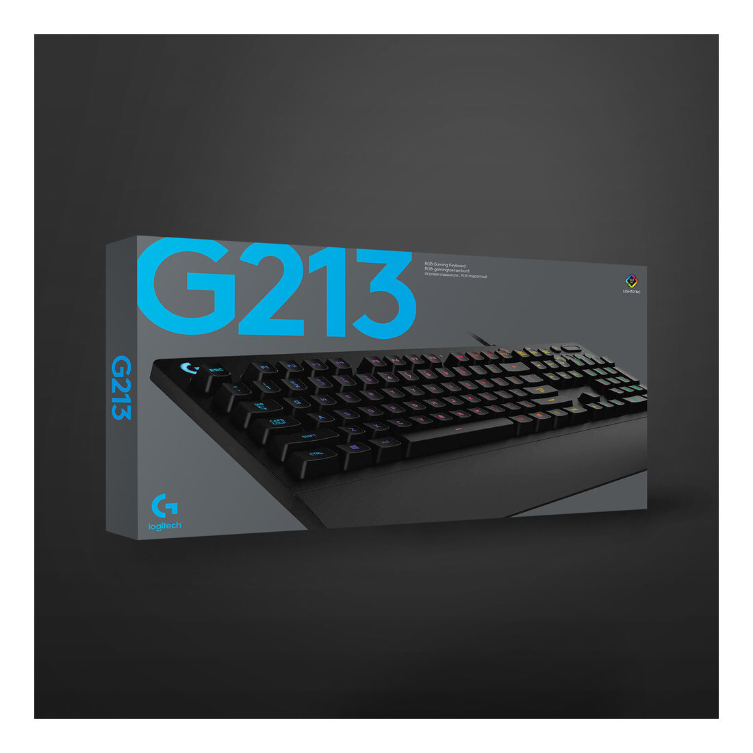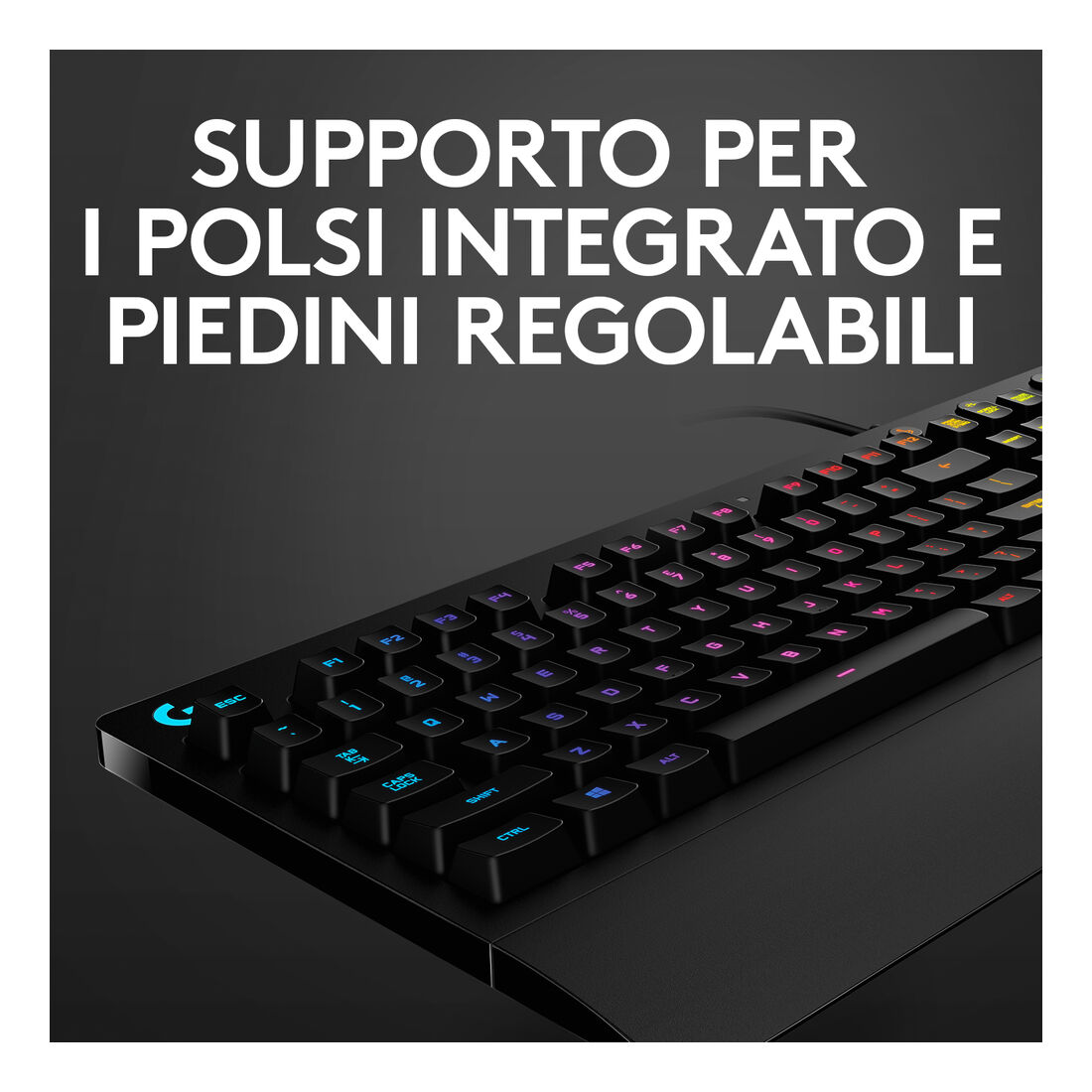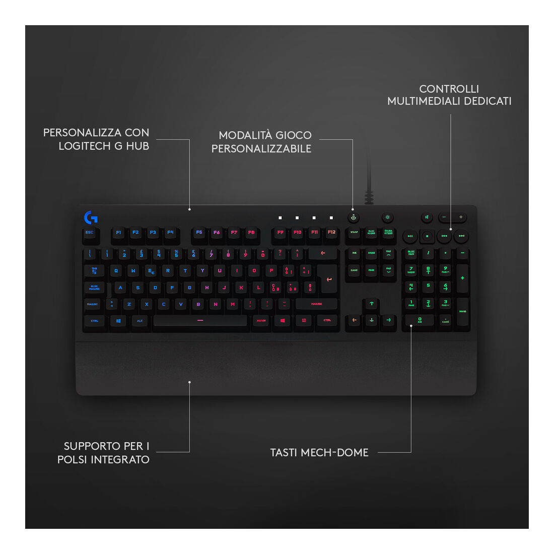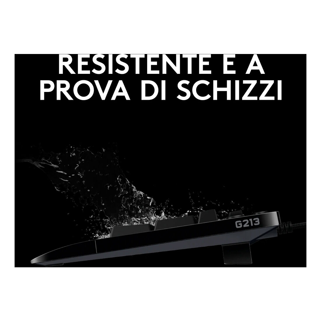 Logitech G Logitech G213 Prodigy Tastiera Gaming Cablata, LIGHTSYNC RGB, Tasti Retroilluminati, Resistente Agli Schizzi, Tasti Personalizzabili, Controlli Dedicati Multimediali, QWERTY Layout Italiano, Nero. Fattore di forma tastiera: Full-size (100%). Stile tastiera: Dritto. Tecnologia di connessione: Cablato, Interfaccia dispositivo: USB, Interruttore a chiave per tastiera: Interruttore a chiave meccanica, Struttura tastiera: QWERTY. Tipologia di retroilluminazione: LED RGB, Riposo del polso. Lunghezza cavo: 1,8 m. Utilizzo raccomandato: Gaming. Colore del prodotto: Nero
