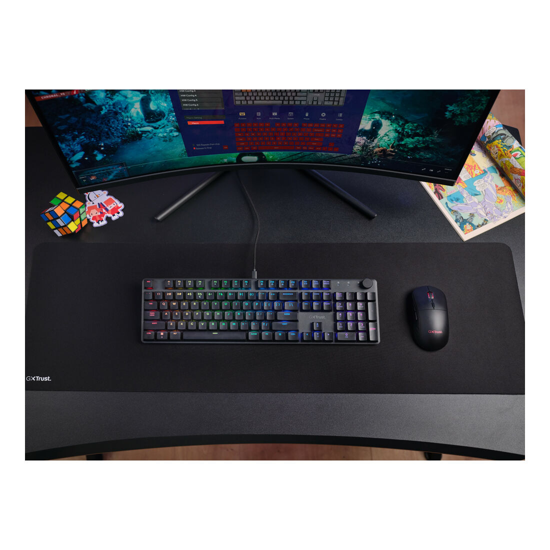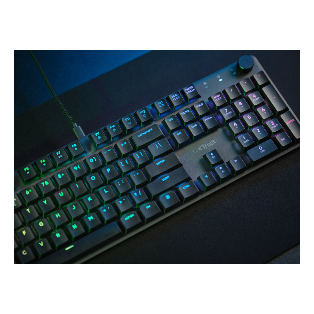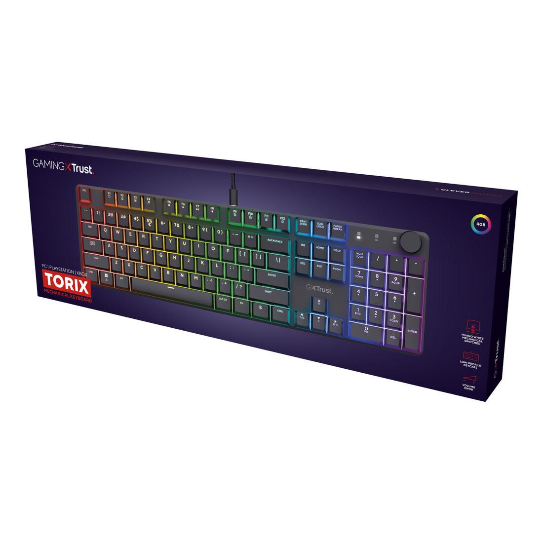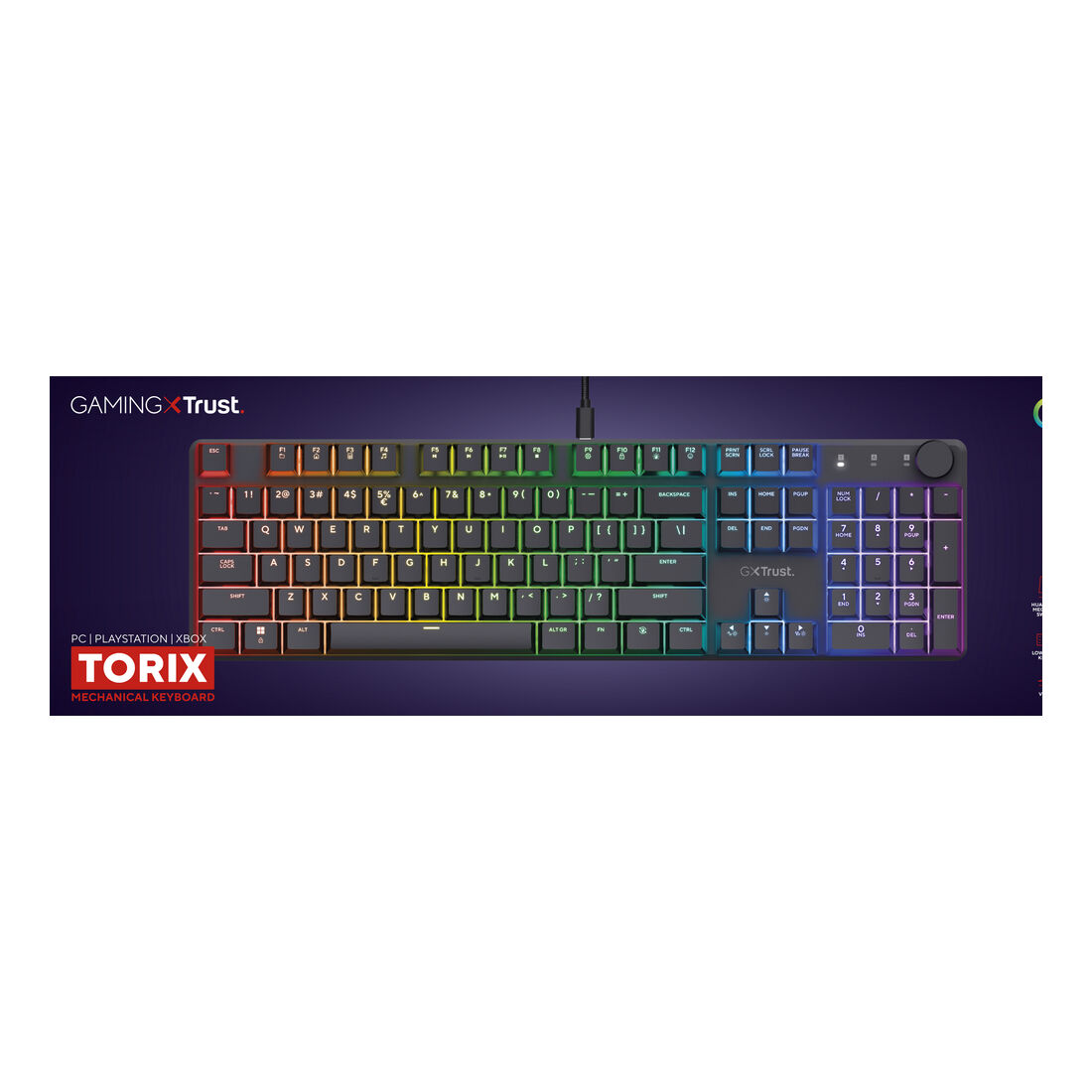 Trust GXT 866 Torix. Fattore di forma tastiera: Full-size (100%), Tecnologia di connessione: Cablato, Interfaccia dispositivo: USB, Interruttore a chiave per tastiera: Interruttore a chiave meccanica, Struttura tastiera: QWERTY, Numero pulsanti tastiera: 104. Tipologia di retroilluminazione: LED RGB. Lunghezza cavo: 1,8 m. Utilizzo raccomandato: Gaming. Colore del prodotto: Nero