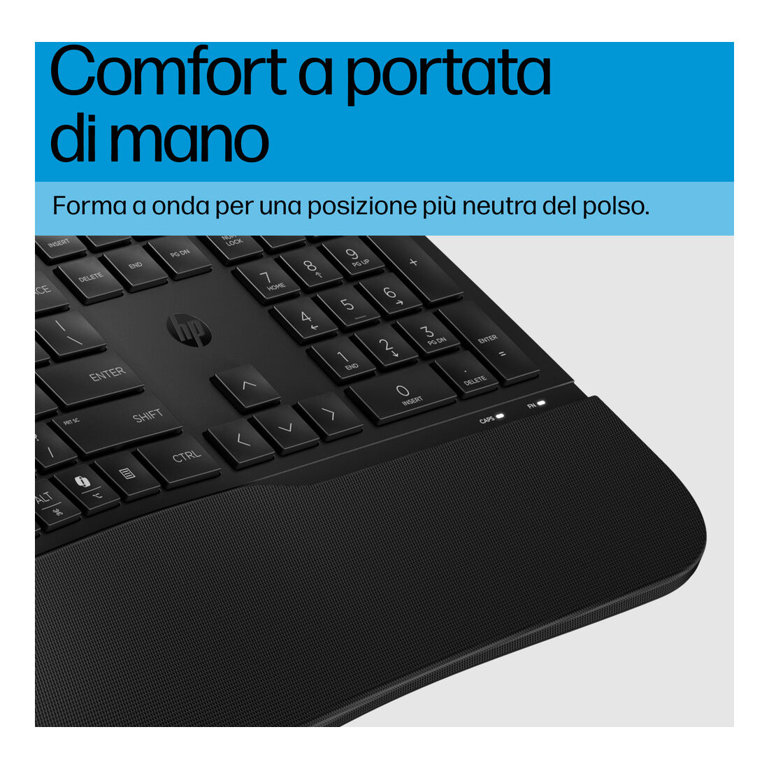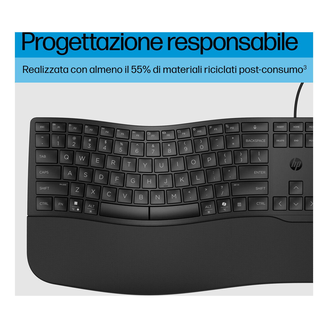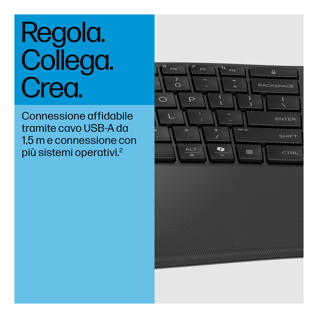 HP 485 Comfort Wired Keyboard. Fattore di forma tastiera: Full-size (100%), Tecnologia di connessione: Cablato, Interfaccia dispositivo: USB, Interruttore a chiave per tastiera: Interruttore a chiave a membrana. Riposo del polso. Lunghezza cavo: 1,5 m. Utilizzo raccomandato: Ufficio. Colore del prodotto: Nero