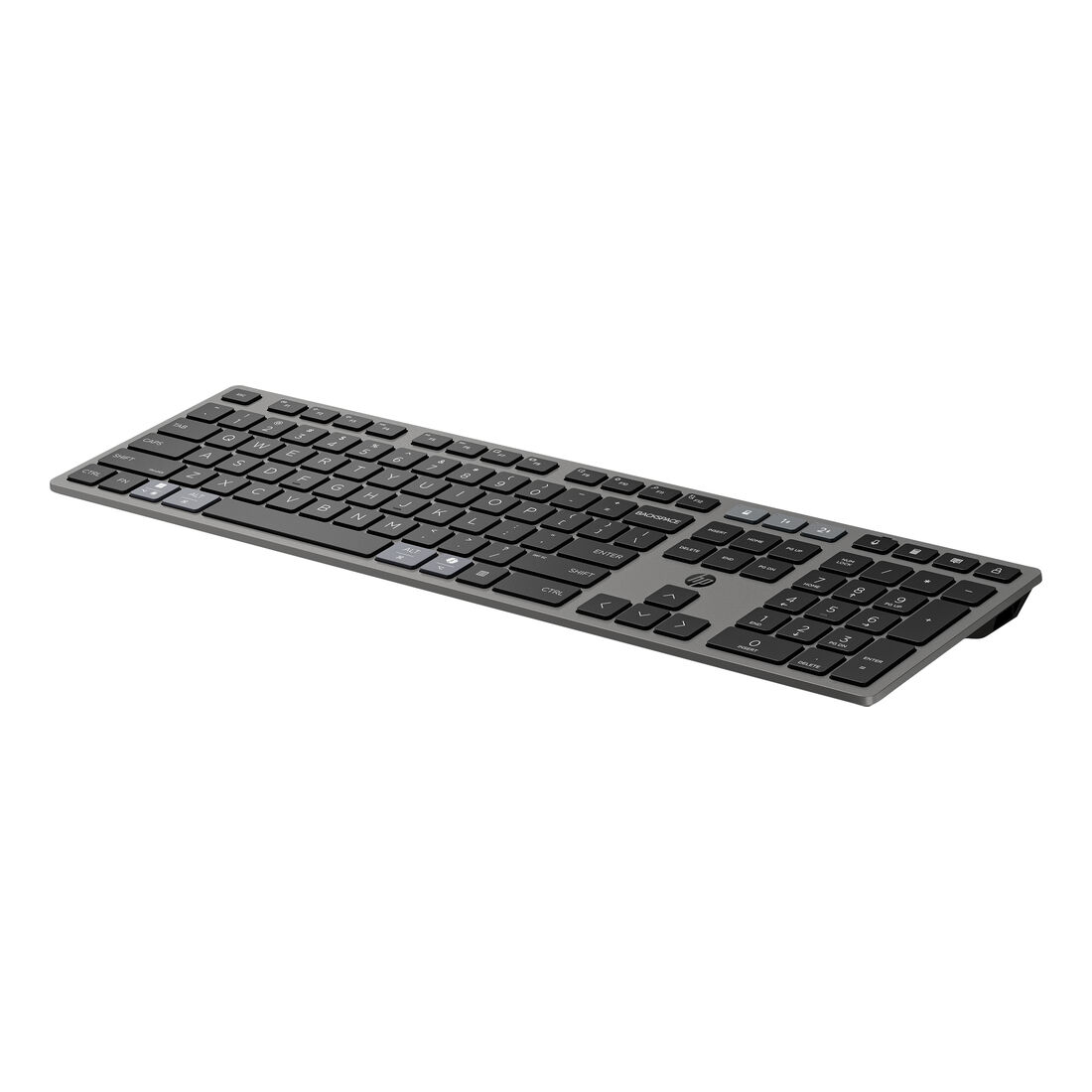 HP Combinazione di tastiera e mouse wireless ricaricabili multidispositivo 725. Fattore di forma tastiera: Full-size (100%), Tecnologia di connessione: Wireless, Interfaccia dispositivo: RF senza fili + Bluetooth, Interruttore a chiave per tastiera: Tasto con meccanismo a forbici, Utilizzo raccomandato: Ufficio. Colore del prodotto: Nero. Mouse incluso
