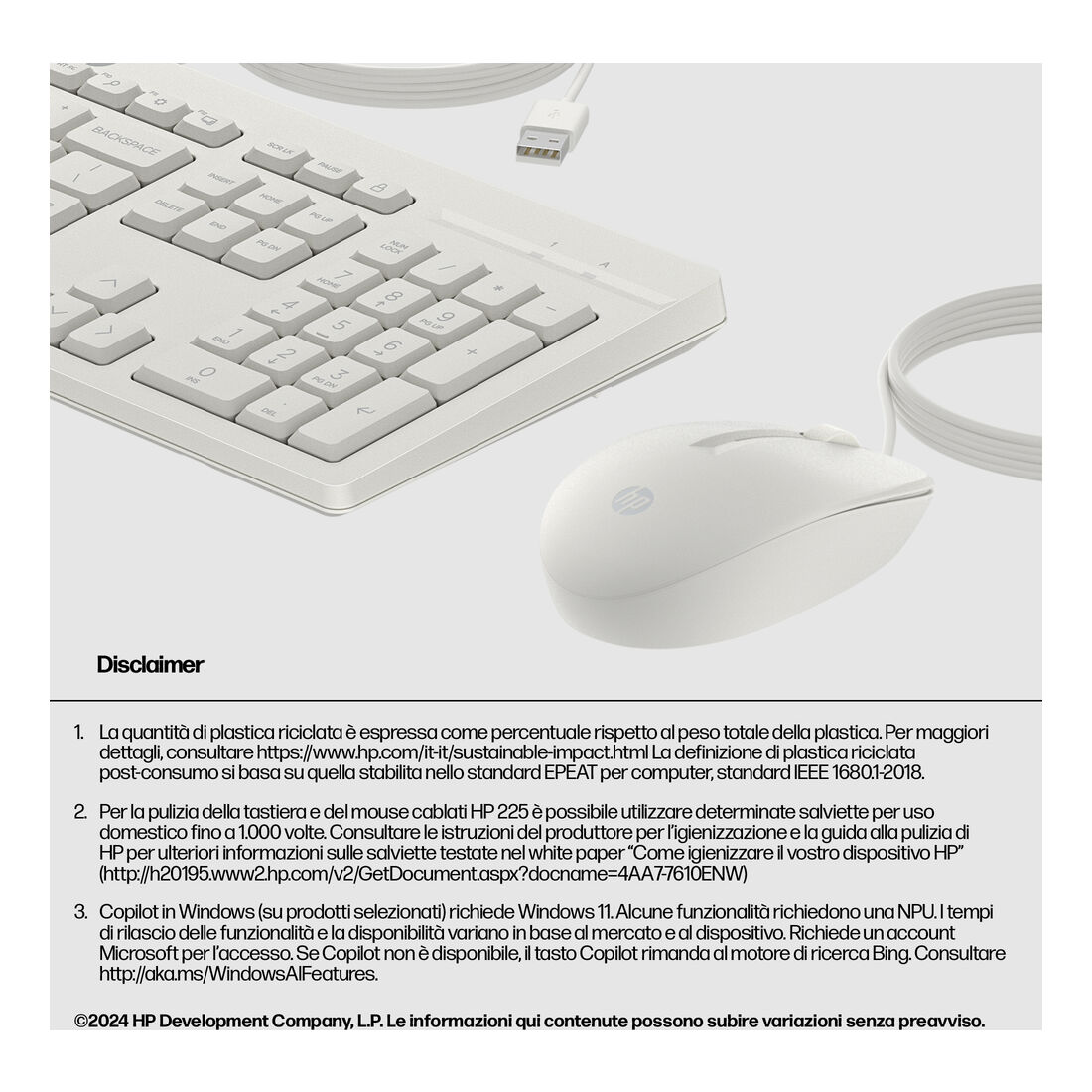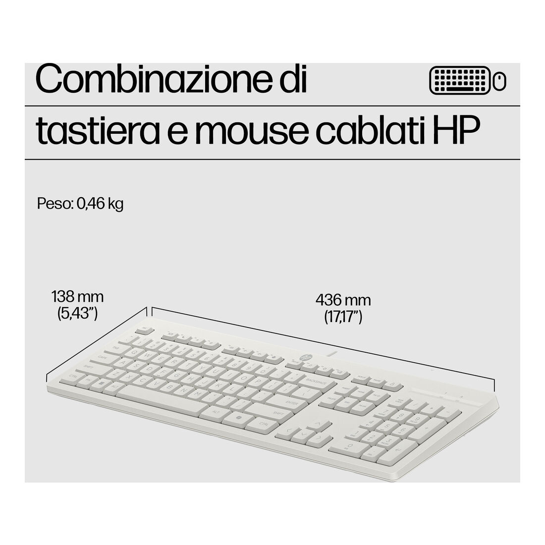 HP Mouse e tastiera 225 Wired. Fattore di forma tastiera: Full-size (100%), Tecnologia di connessione: Cablato, Interfaccia dispositivo: USB. Lunghezza cavo: 1,8 m. Utilizzo raccomandato: Ufficio. Colore del prodotto: Bianco. Mouse incluso