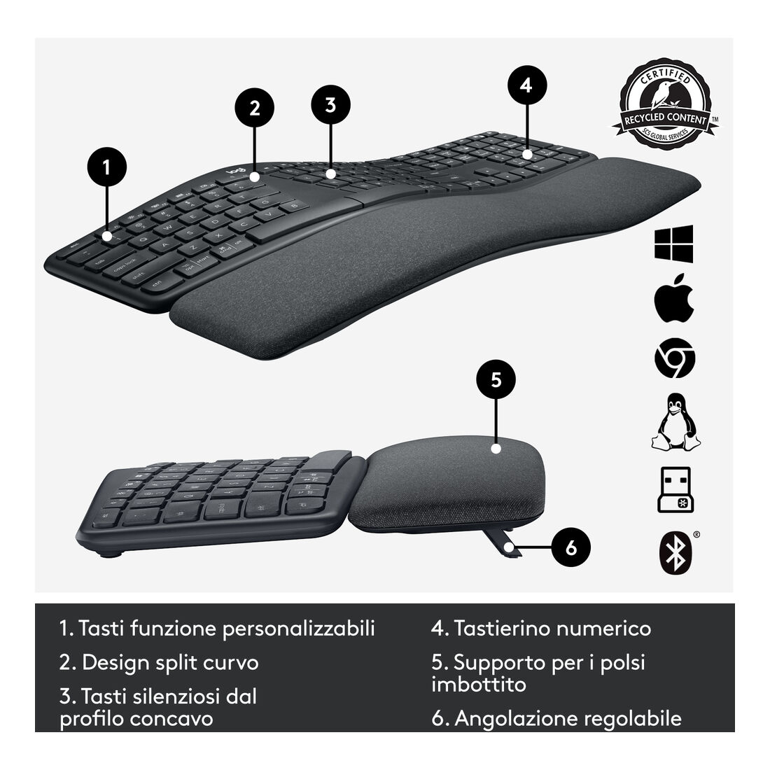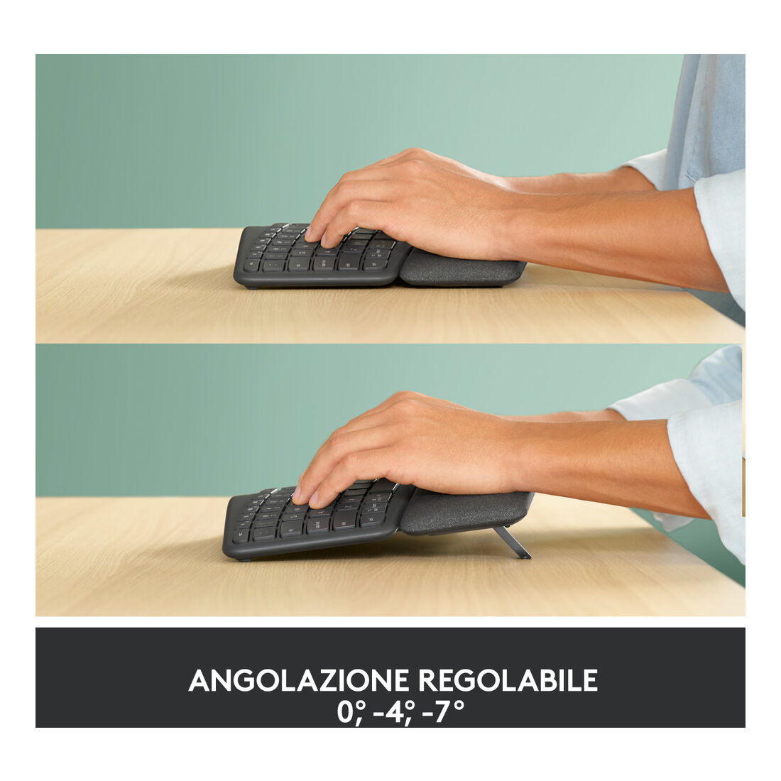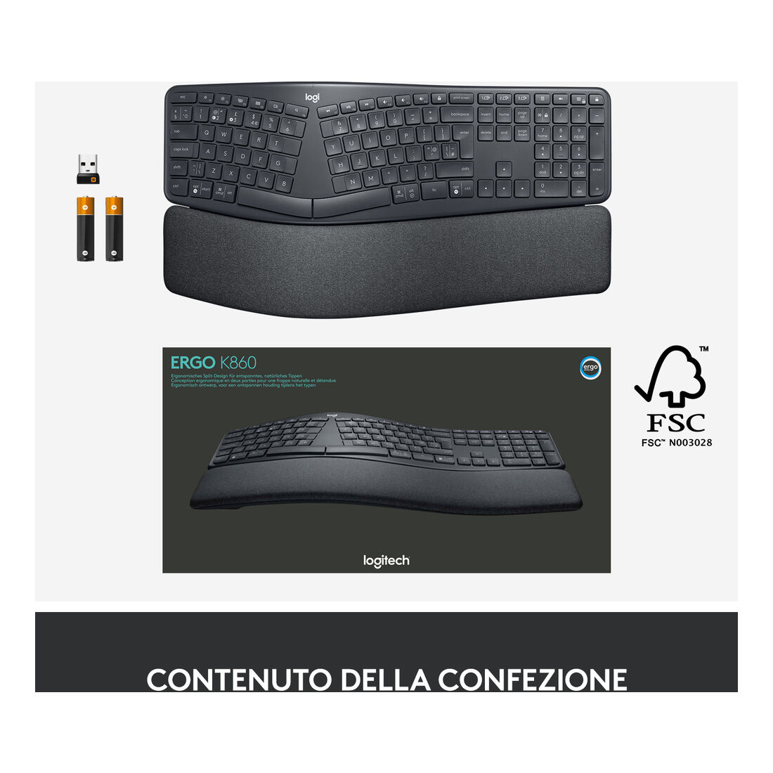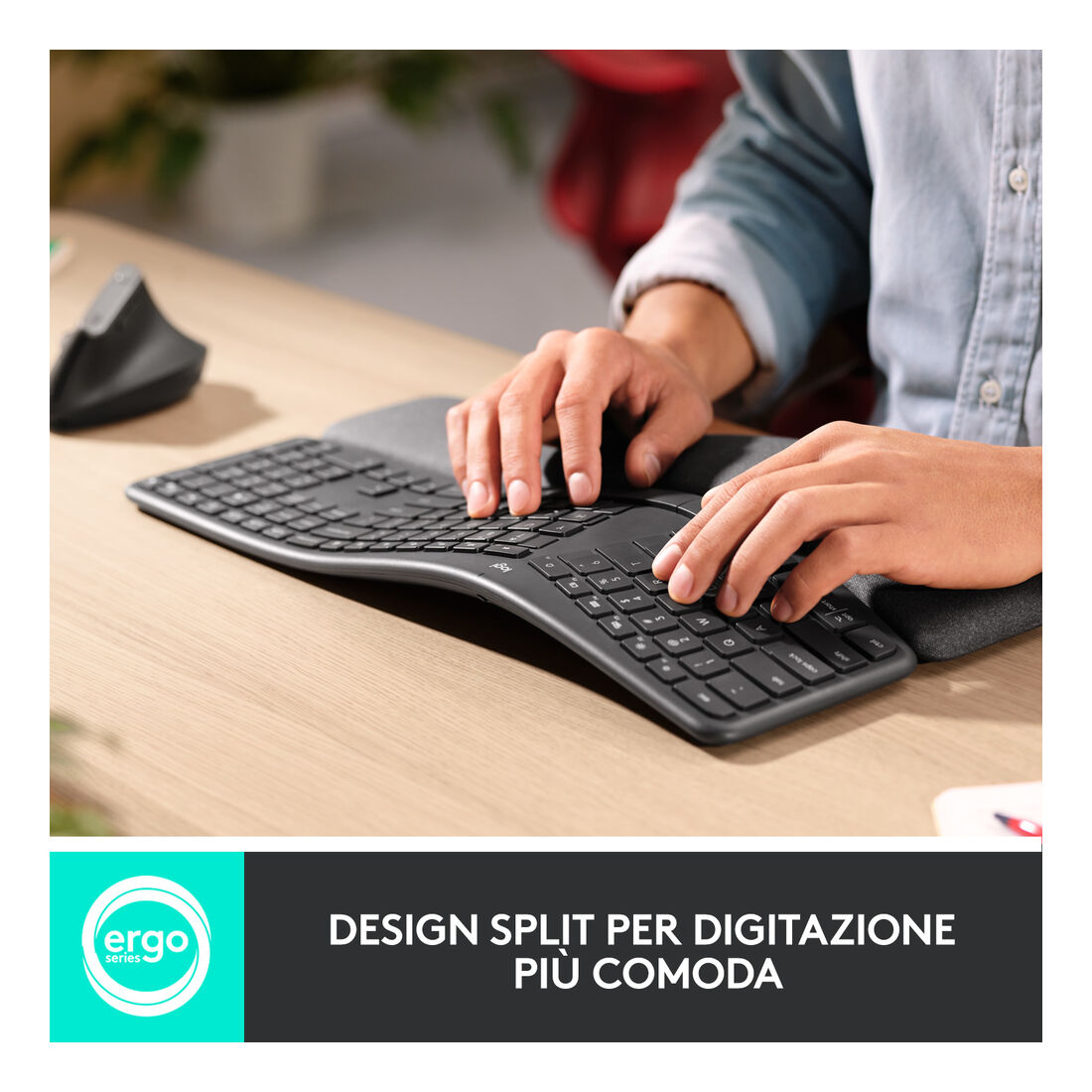 Logitech ERGO K860. Fattore di forma tastiera: Full-size (100%). Stile tastiera: Curvo. Tecnologia di connessione: Wireless, Interfaccia dispositivo: RF senza fili + Bluetooth, Interruttore a chiave per tastiera: Interruttore a chiave semimeccanico, Struttura tastiera: QWERTY. Riposo del polso. Utilizzo raccomandato: Ufficio. Colore del prodotto: Grafite