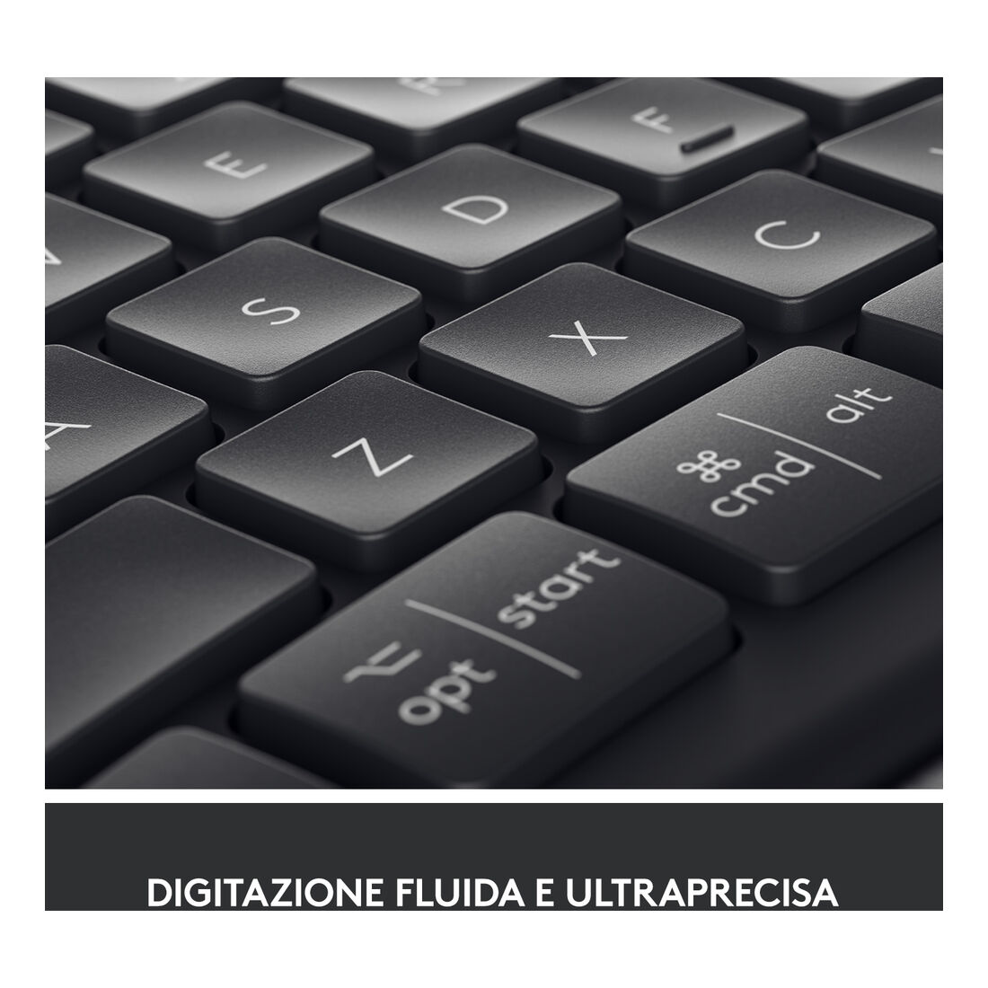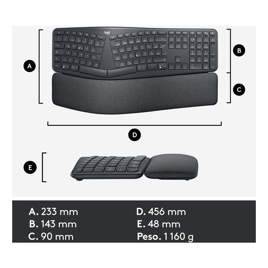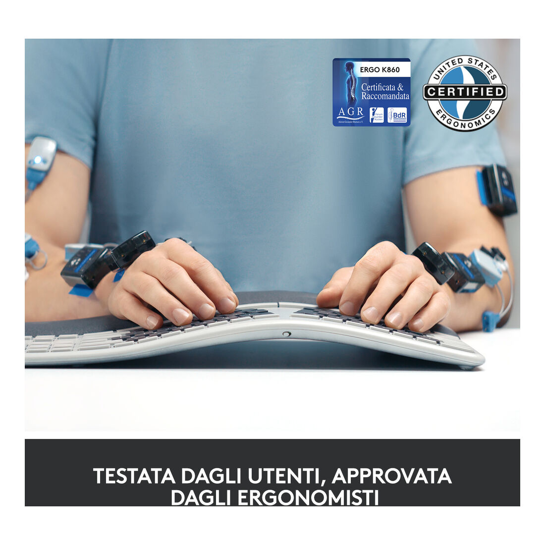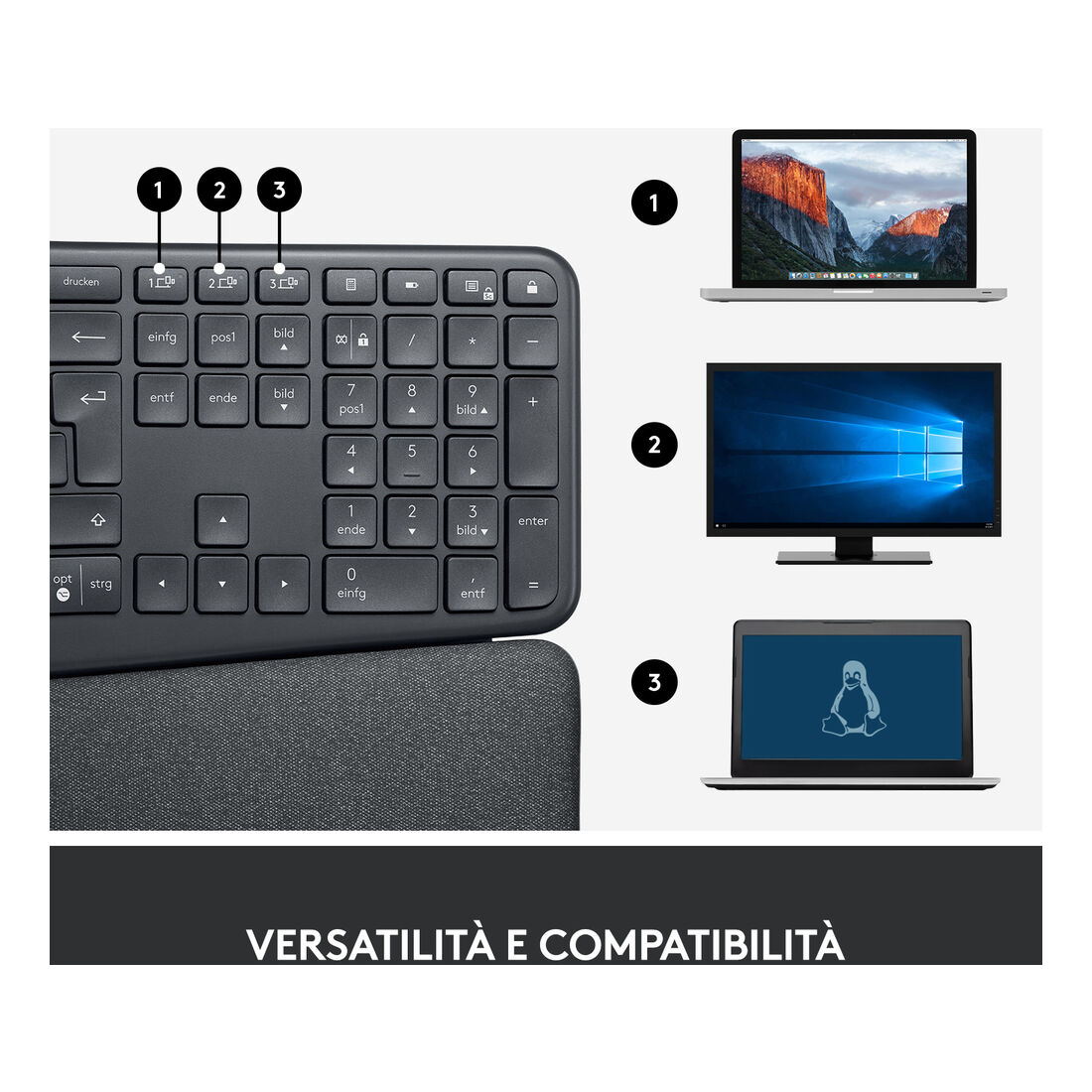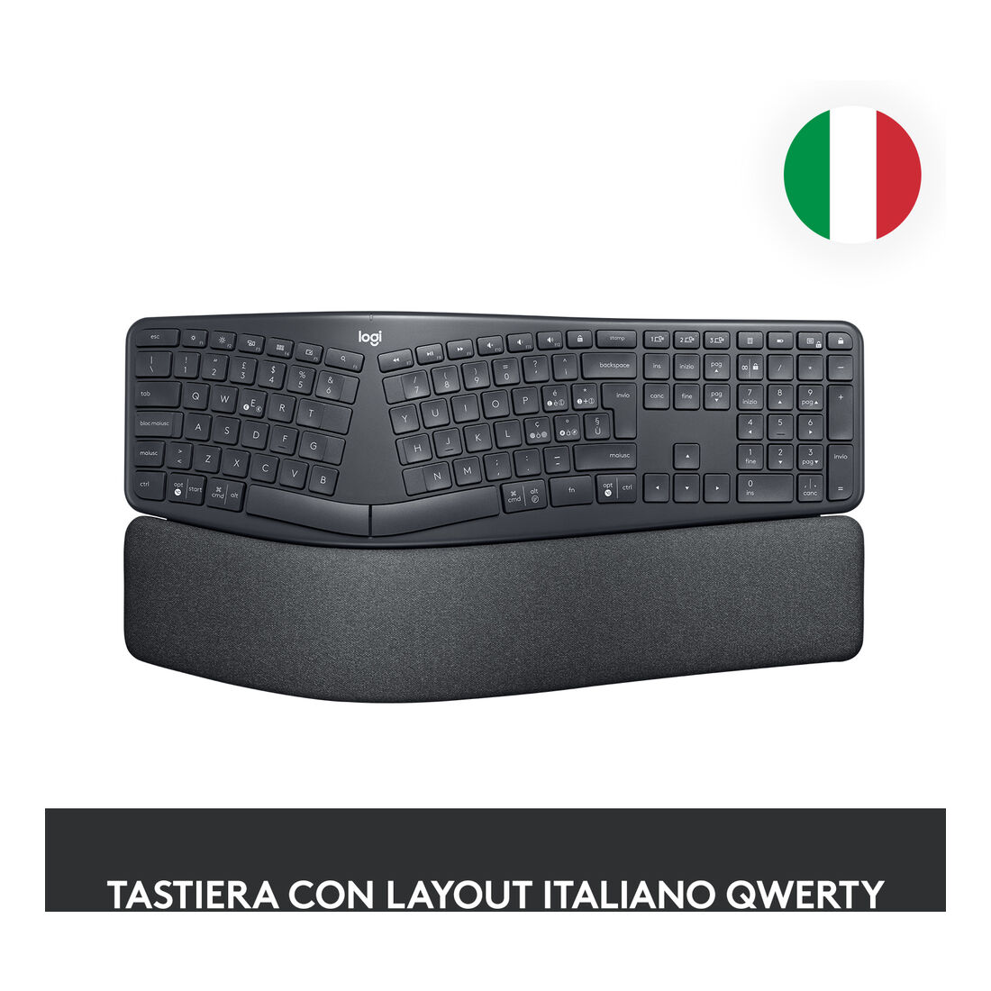 Logitech ERGO K860. Fattore di forma tastiera: Full-size (100%). Stile tastiera: Curvo. Tecnologia di connessione: Wireless, Interfaccia dispositivo: RF senza fili + Bluetooth, Interruttore a chiave per tastiera: Interruttore a chiave semimeccanico, Struttura tastiera: QWERTY. Riposo del polso. Utilizzo raccomandato: Ufficio. Colore del prodotto: Grafite