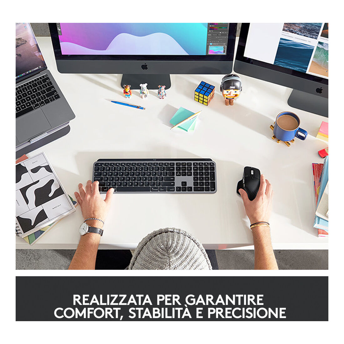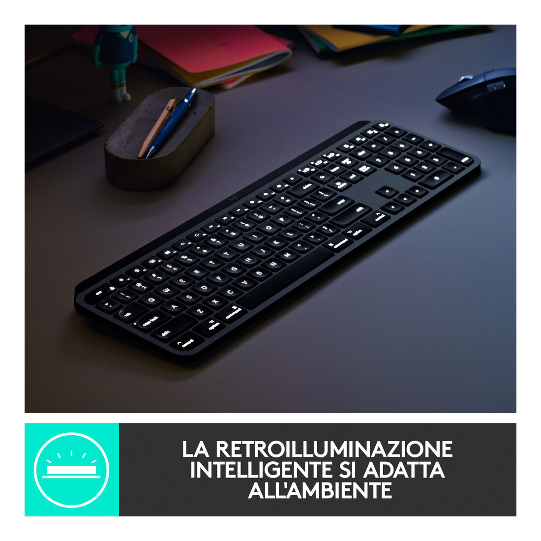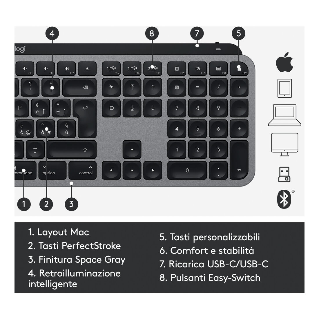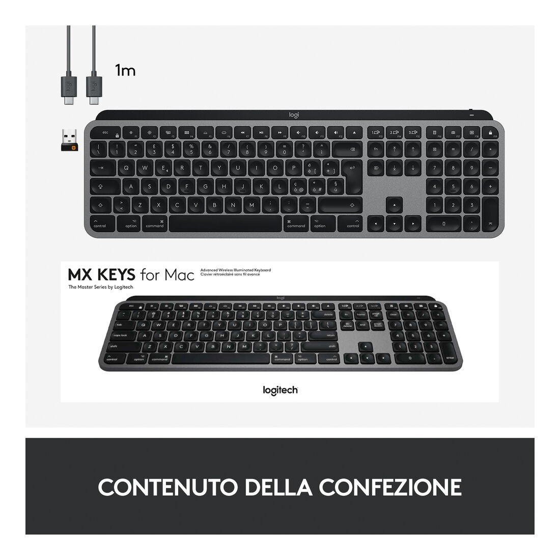 Logitech MX Keys Tastiera Wireless Illuminata Avanzata per Mac, Digitazione Tattile, Tasti Retroilluminati a LED, Bluetooth, USB-C, Batteria 10 giorni, Apple macOS, Struttura Metallica. Fattore di forma tastiera: Full-size (100%). Stile tastiera: Dritto. Tecnologia di connessione: Wireless, Interfaccia dispositivo: RF senza fili + Bluetooth, Struttura tastiera: QWERTY, Utilizzo raccomandato: Ufficio. Colore del prodotto: Grigio