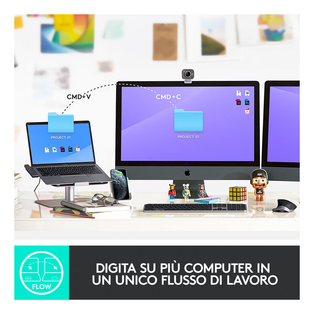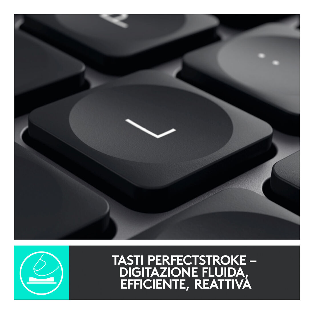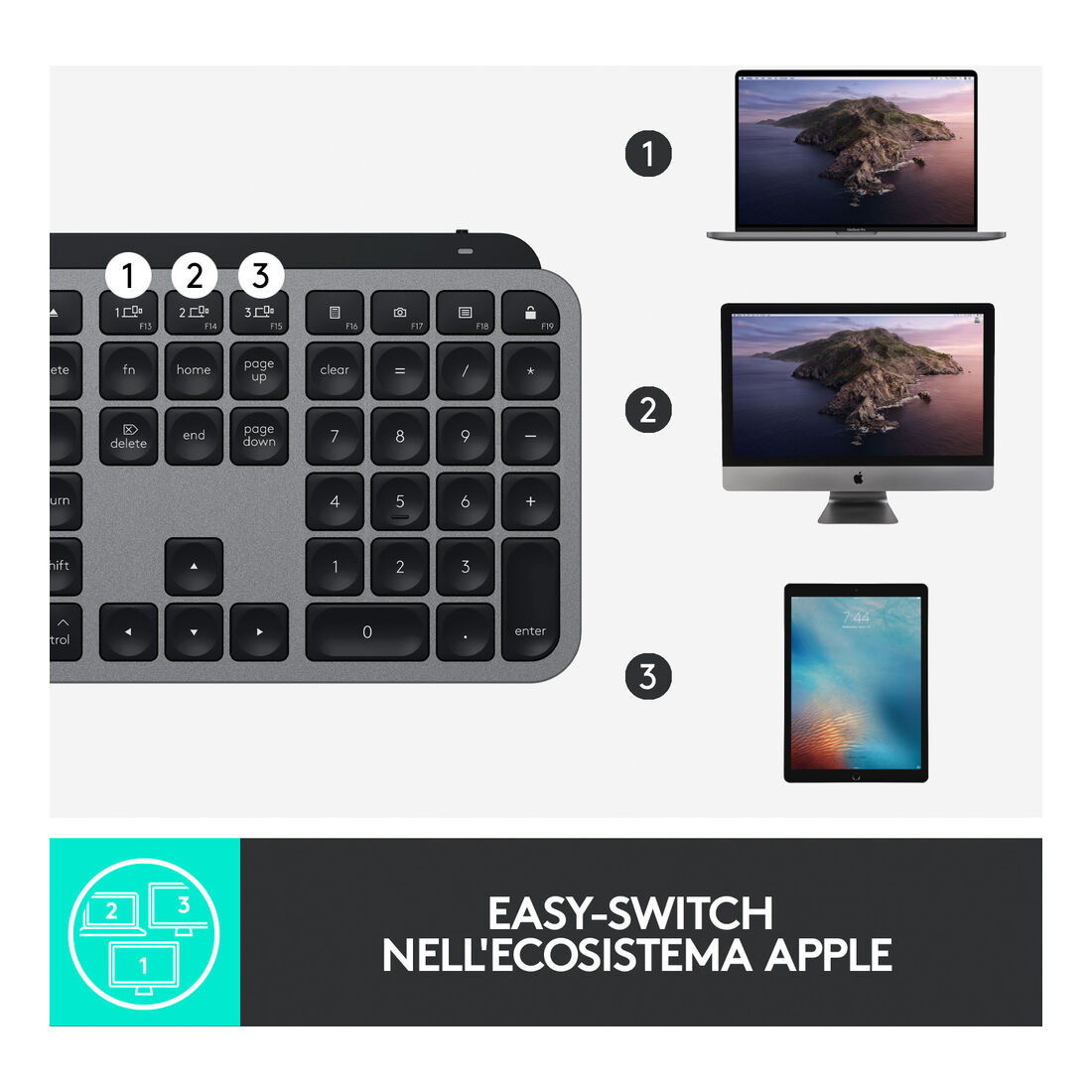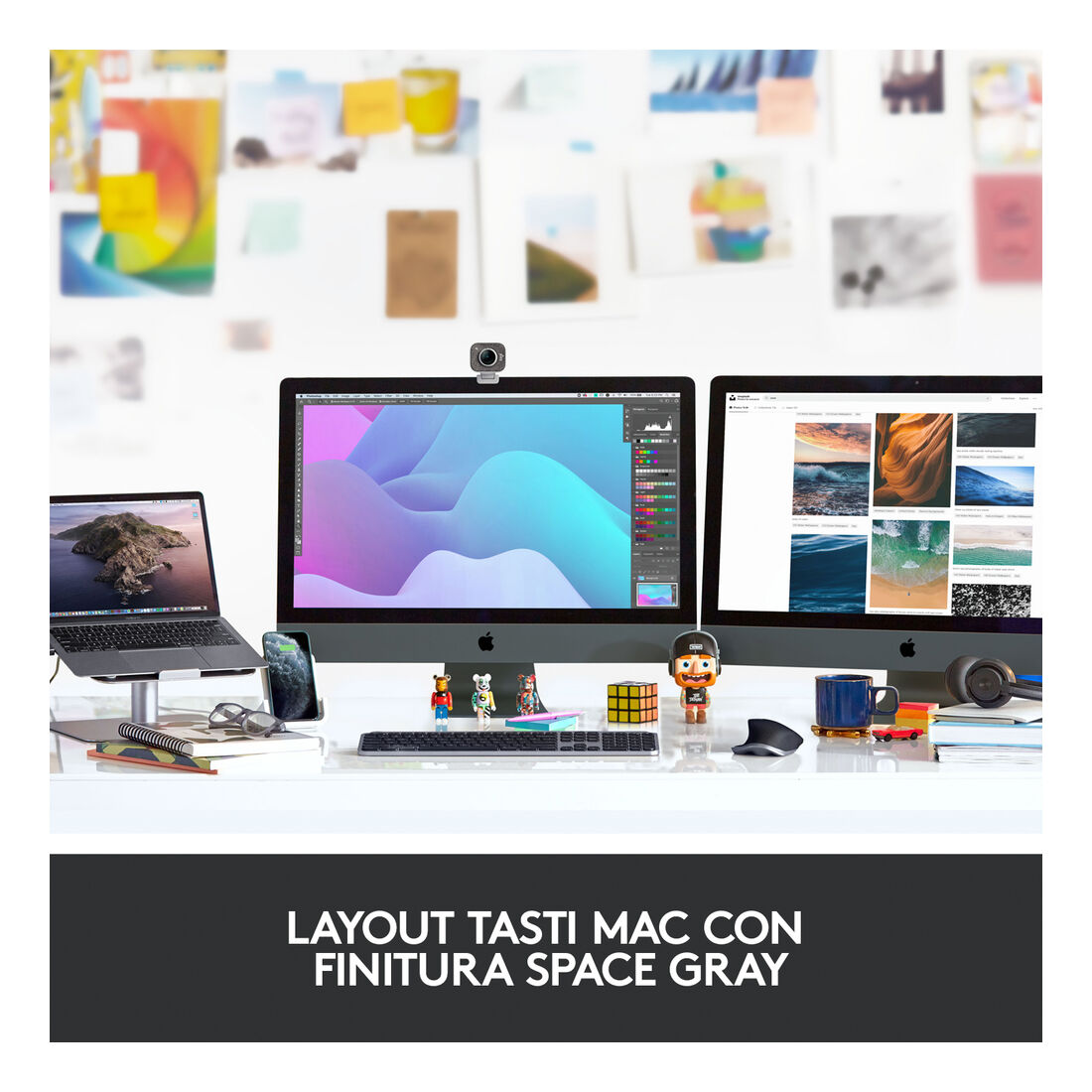 Logitech MX Keys Tastiera Wireless Illuminata Avanzata per Mac, Digitazione Tattile, Tasti Retroilluminati a LED, Bluetooth, USB-C, Batteria 10 giorni, Apple macOS, Struttura Metallica. Fattore di forma tastiera: Full-size (100%). Stile tastiera: Dritto. Tecnologia di connessione: Wireless, Interfaccia dispositivo: RF senza fili + Bluetooth, Struttura tastiera: QWERTY, Utilizzo raccomandato: Ufficio. Colore del prodotto: Grigio