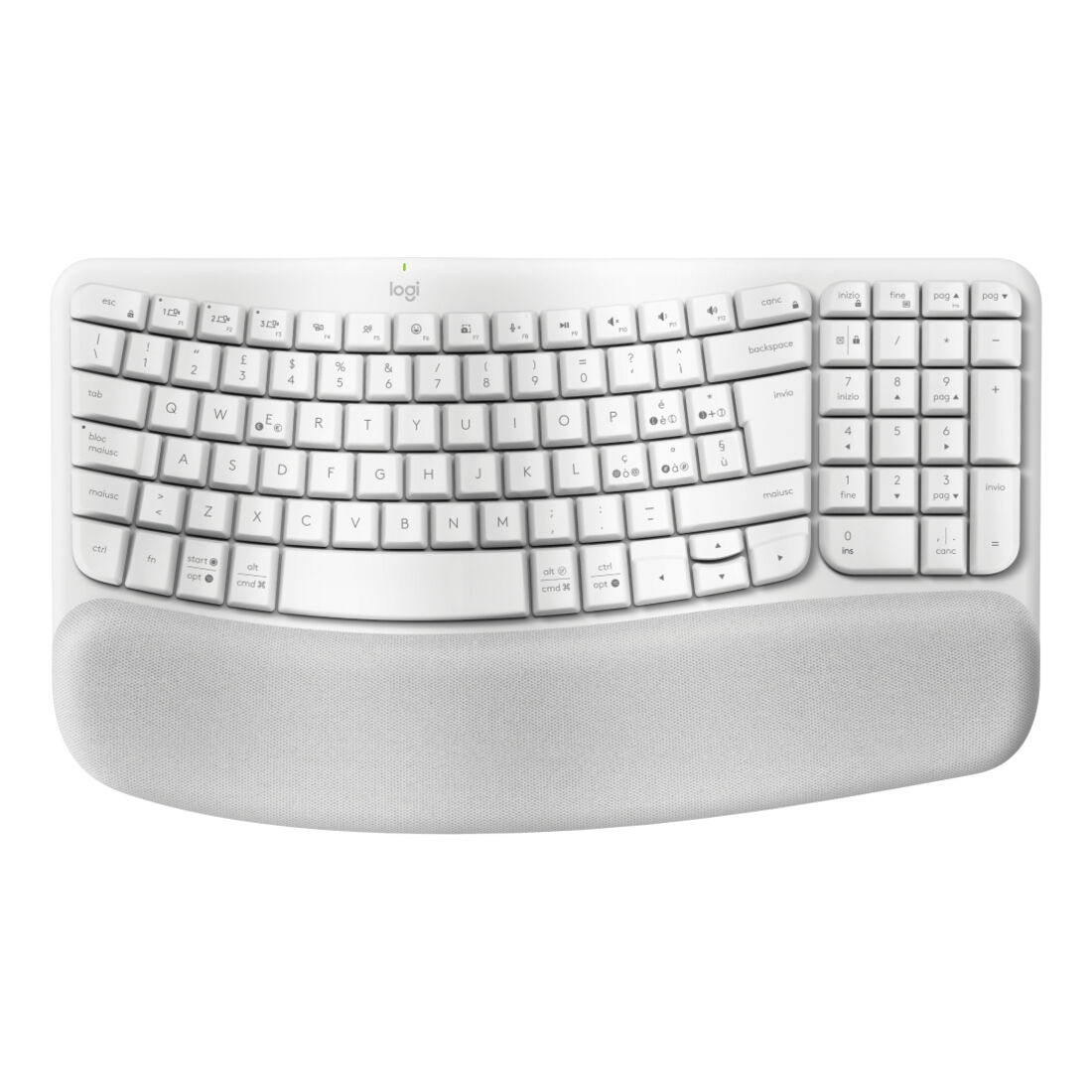 Logitech 920-012294. Fattore di forma tastiera: Full-size (100%). Stile tastiera: Curvo. Tecnologia di connessione: Wireless, Interfaccia dispositivo: RF senza fili + Bluetooth, Interruttore a chiave per tastiera: Interruttore a chiave a membrana, Struttura tastiera: QWERTY. Riposo del polso. Utilizzo raccomandato: Ufficio. Colore del prodotto: Bianco