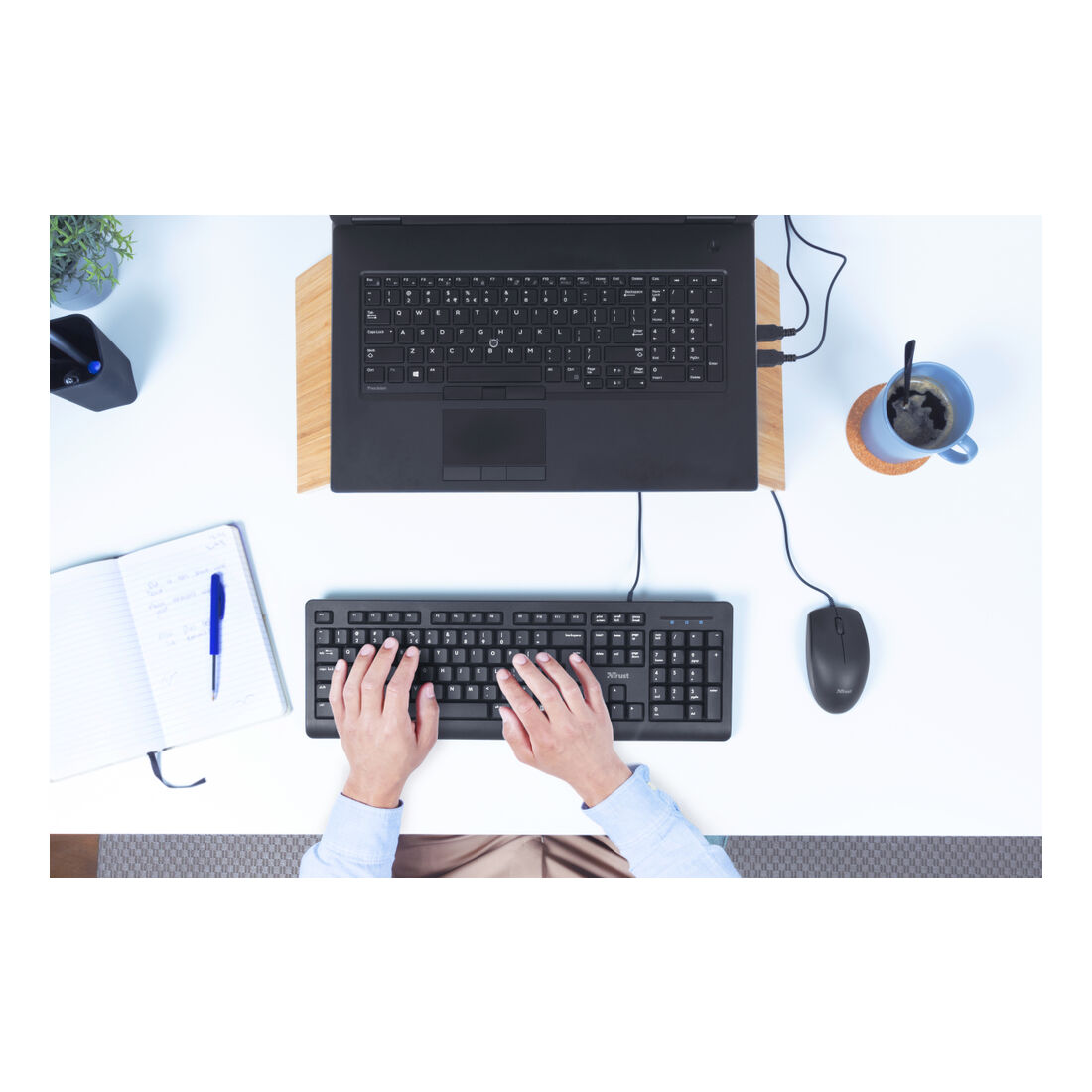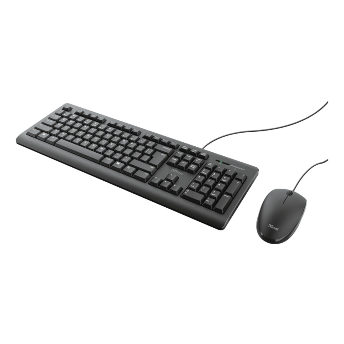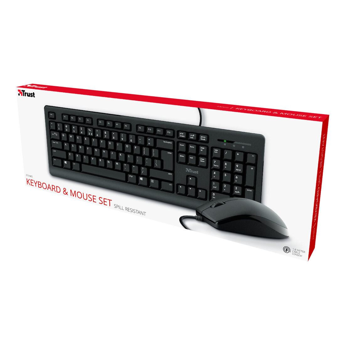 Trust Primo Keyboard & Mouse Set. Fattore di forma tastiera: Full-size (100%). Stile tastiera: Dritto. Tecnologia di connessione: Cablato, Interfaccia dispositivo: USB, Interruttore a chiave per tastiera: Interruttore a chiave a membrana, Struttura tastiera: QWERTY. Lunghezza cavo: 1,8 m. Utilizzo raccomandato: Ufficio. Colore del prodotto: Nero. Mouse incluso