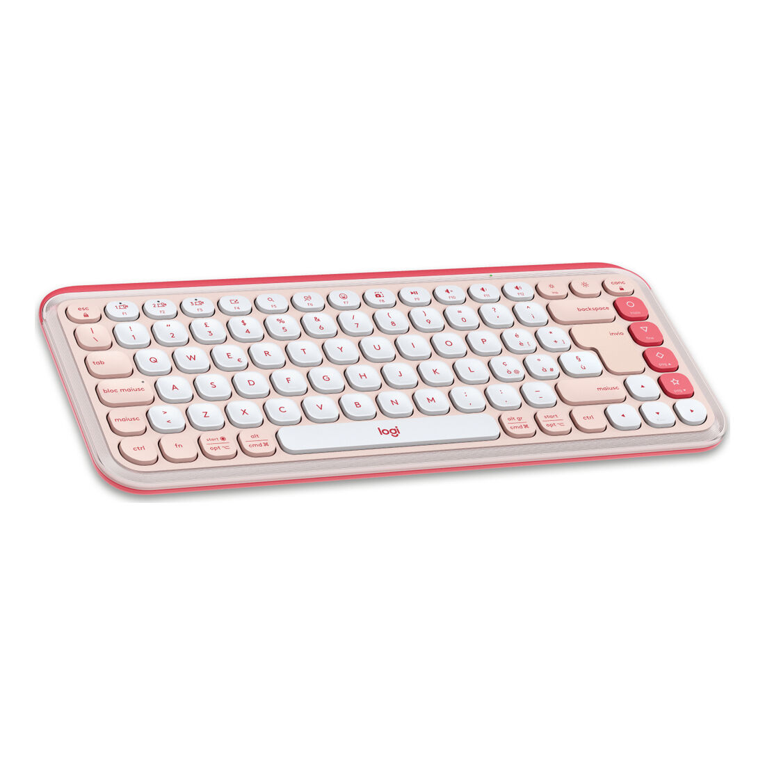 Logitech 920-013117. Fattore di forma tastiera: Mini. Stile tastiera: Dritto. Tecnologia di connessione: Wireless, Interfaccia dispositivo: Bluetooth, Interruttore a chiave per tastiera: Tasto con meccanismo a forbici, Struttura tastiera: QWERTY, Utilizzo raccomandato: Universale. Colore del prodotto: Rosa. Mouse incluso