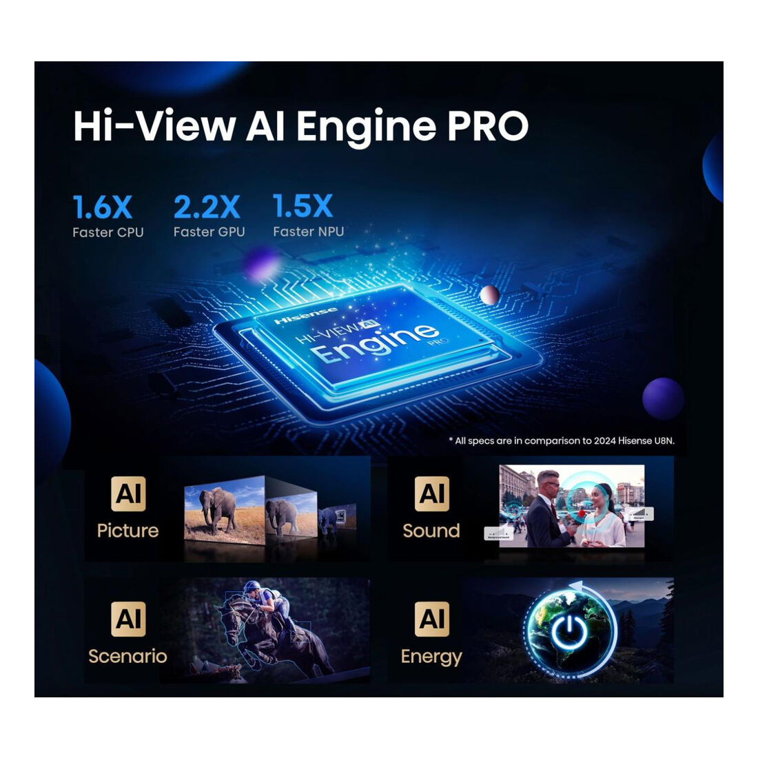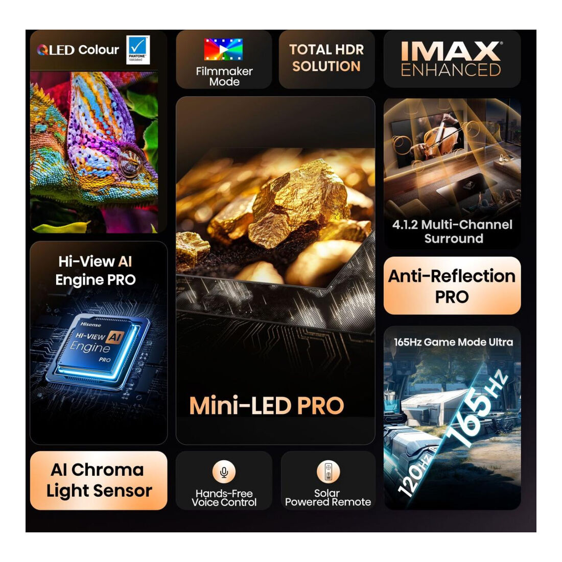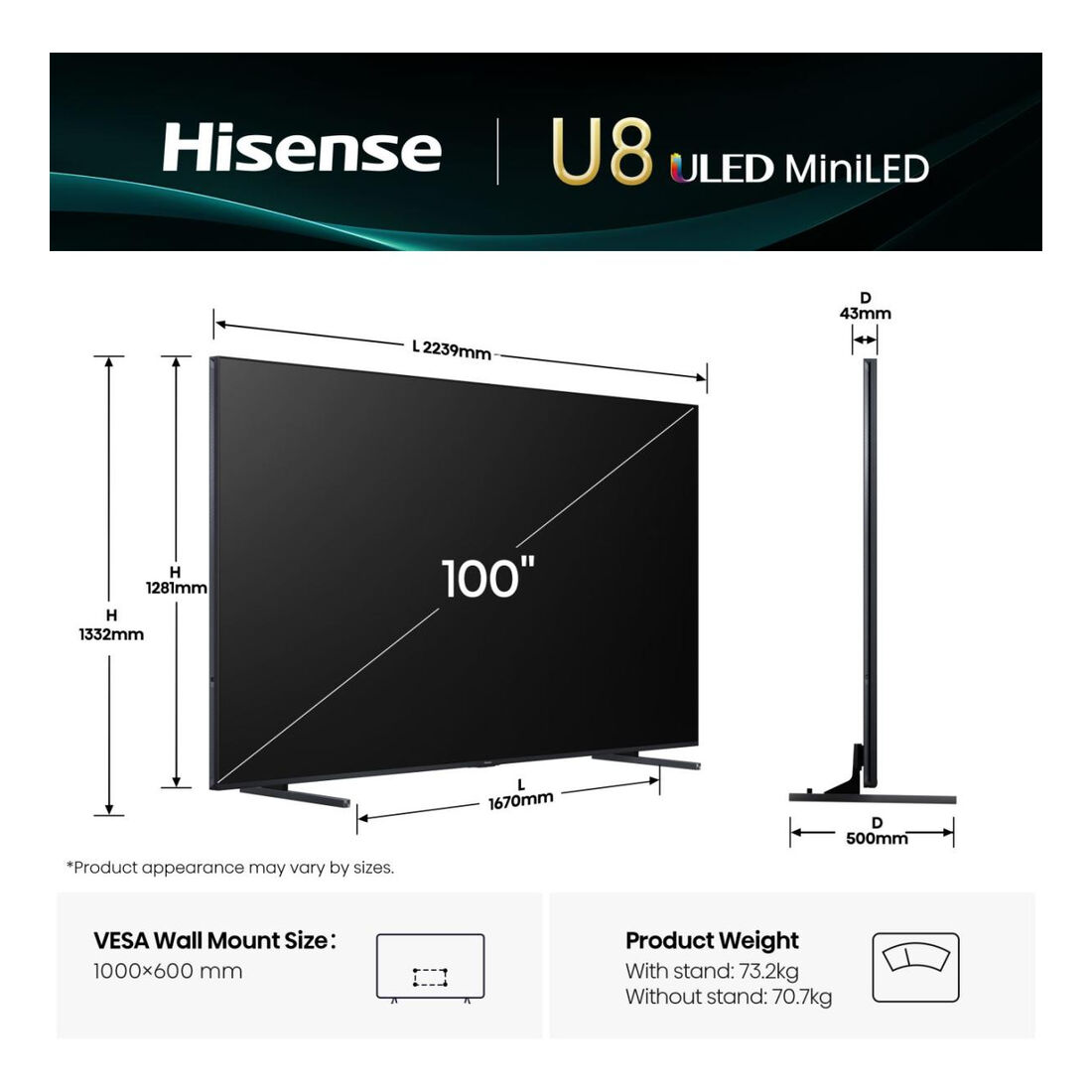 Hisense 100U8Q. Dimensioni diagonale schermo: 2,54 m (100″), Risoluzione del display: 3840 x 2160 Pixel, Tipologia HD: 4K Ultra HD, Tecnologia display: ULED, Forma dello schermo: Piatto, Tipo di retroilluminazione LED: Mini LED. Smart TV. Tempo di risposta: 6 ms, Rapporto di contrasto: 5000:1, Rapporto d’aspetto nativo: 16:9. Formato del segnale digitale: DVB-C, DVB-S, DVB-S2, DVB-T2. Wi-Fi, Collegamento ethernet LAN. Colore del prodotto: Nero, Grigio
