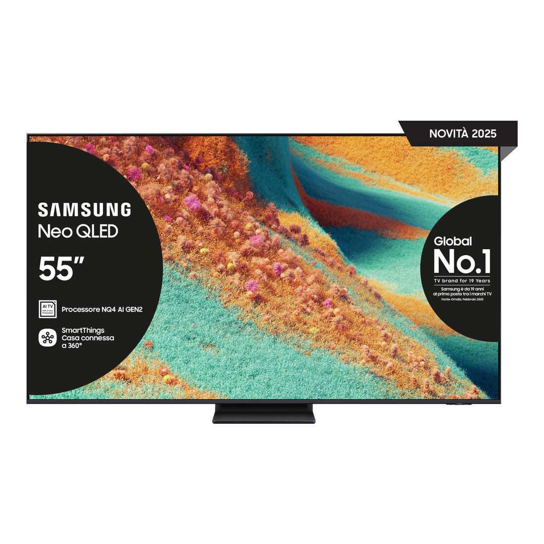 Samsung Smart TV 55″ QE55QN85FAUXZT Neo QLED 4K Mini LED 2025. Dimensioni diagonale schermo: 139,7 cm (55″), Risoluzione del display: 3840 x 2160 Pixel, Tipologia HD: 4K Ultra HD, Tecnologia display: Neo QLED, Forma dello schermo: Piatto. Smart TV. Tecnologia di interpolazione del movimento: Motion Xcelerator. Formato del segnale digitale: DVB-C, DVB-S2, DVB-T2. Wi-Fi, Collegamento ethernet LAN. Colore del prodotto: Argento