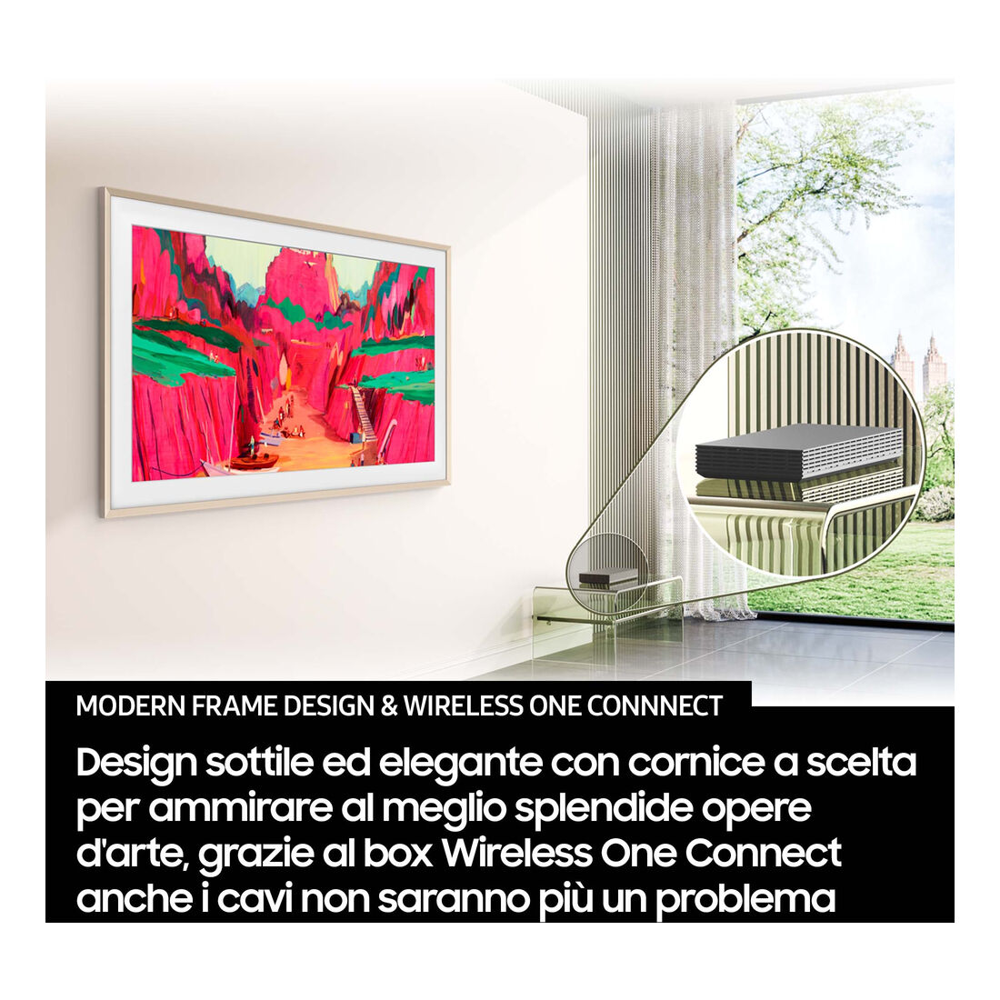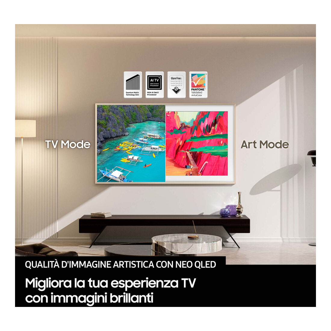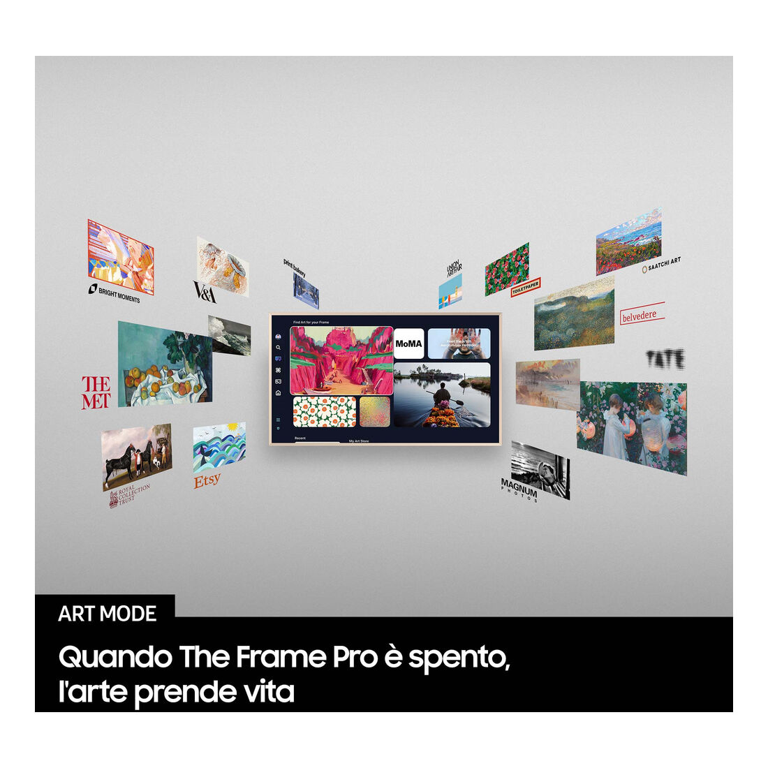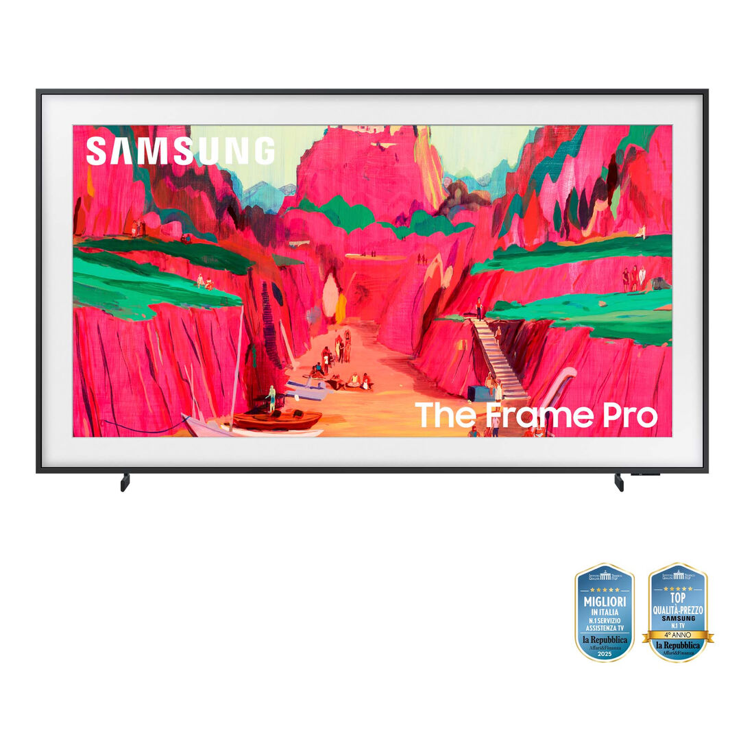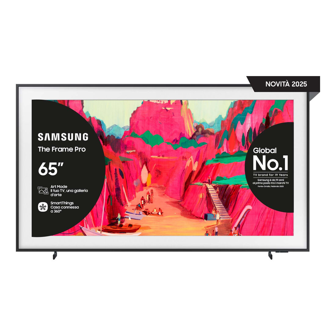 Samsung Smart TV 65″ QE65LS03FWUXZT The Frame Pro 4K 2025. Dimensioni diagonale schermo: 165,1 cm (65″), Risoluzione del display: 3840 x 2160 Pixel, Tipologia HD: 4K Ultra HD, Tecnologia display: Neo QLED, Forma dello schermo: Piatto. Smart TV. Tecnologia di interpolazione del movimento: Motion Xcelerator. Formato del segnale digitale: DVB-C, DVB-S2, DVB-T2. Wi-Fi, Collegamento ethernet LAN. Colore del prodotto: Nero