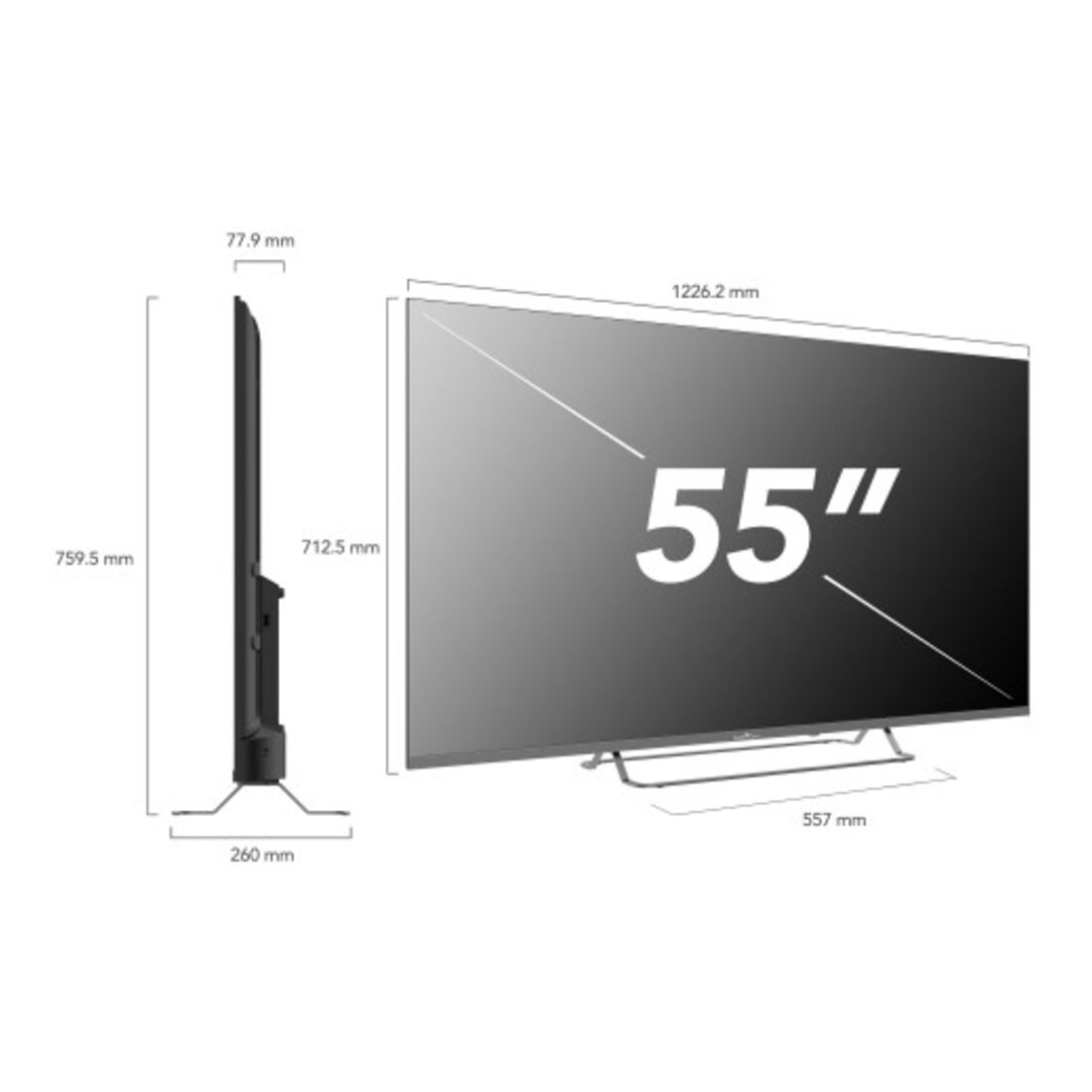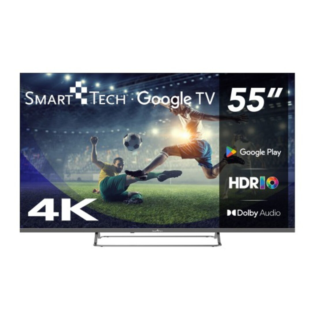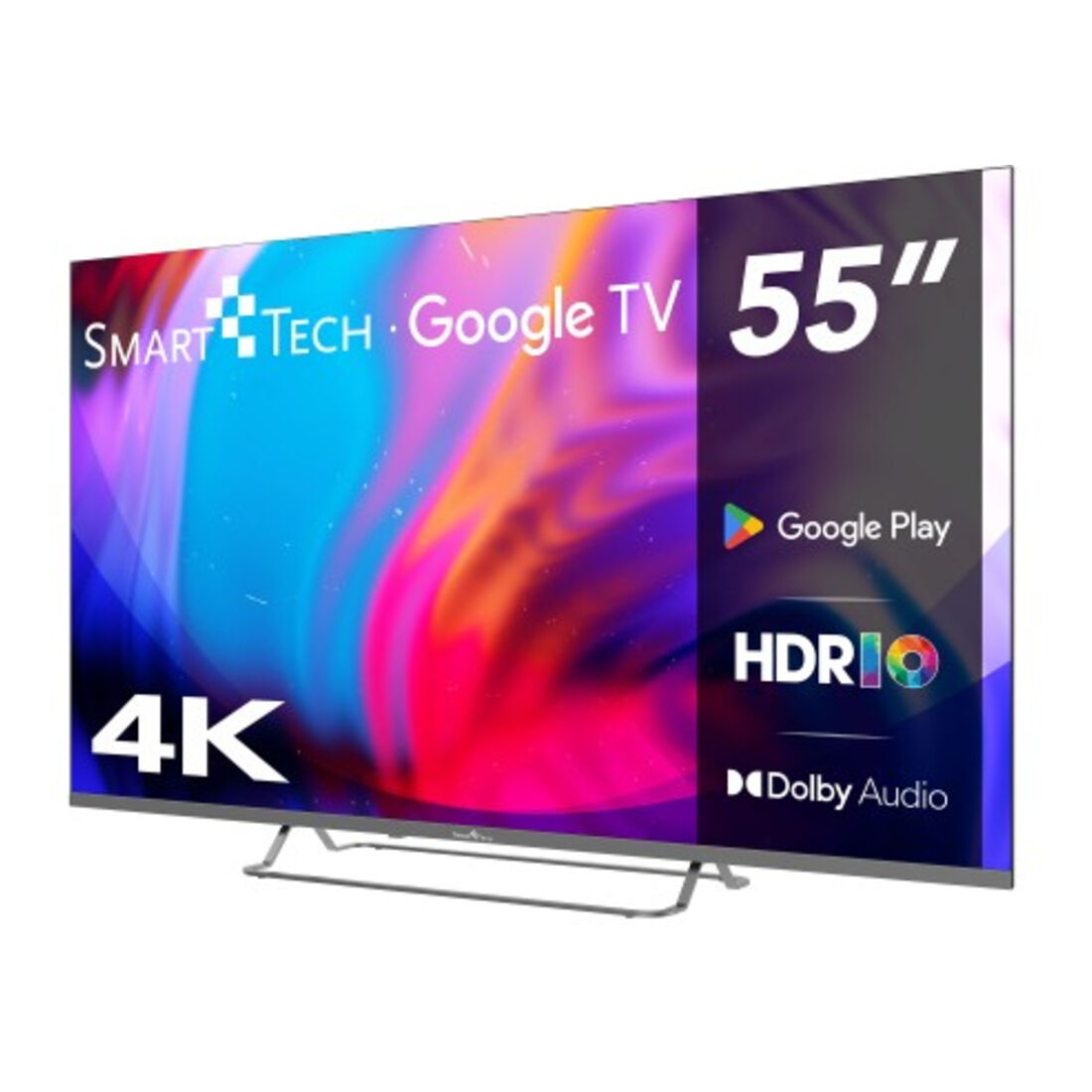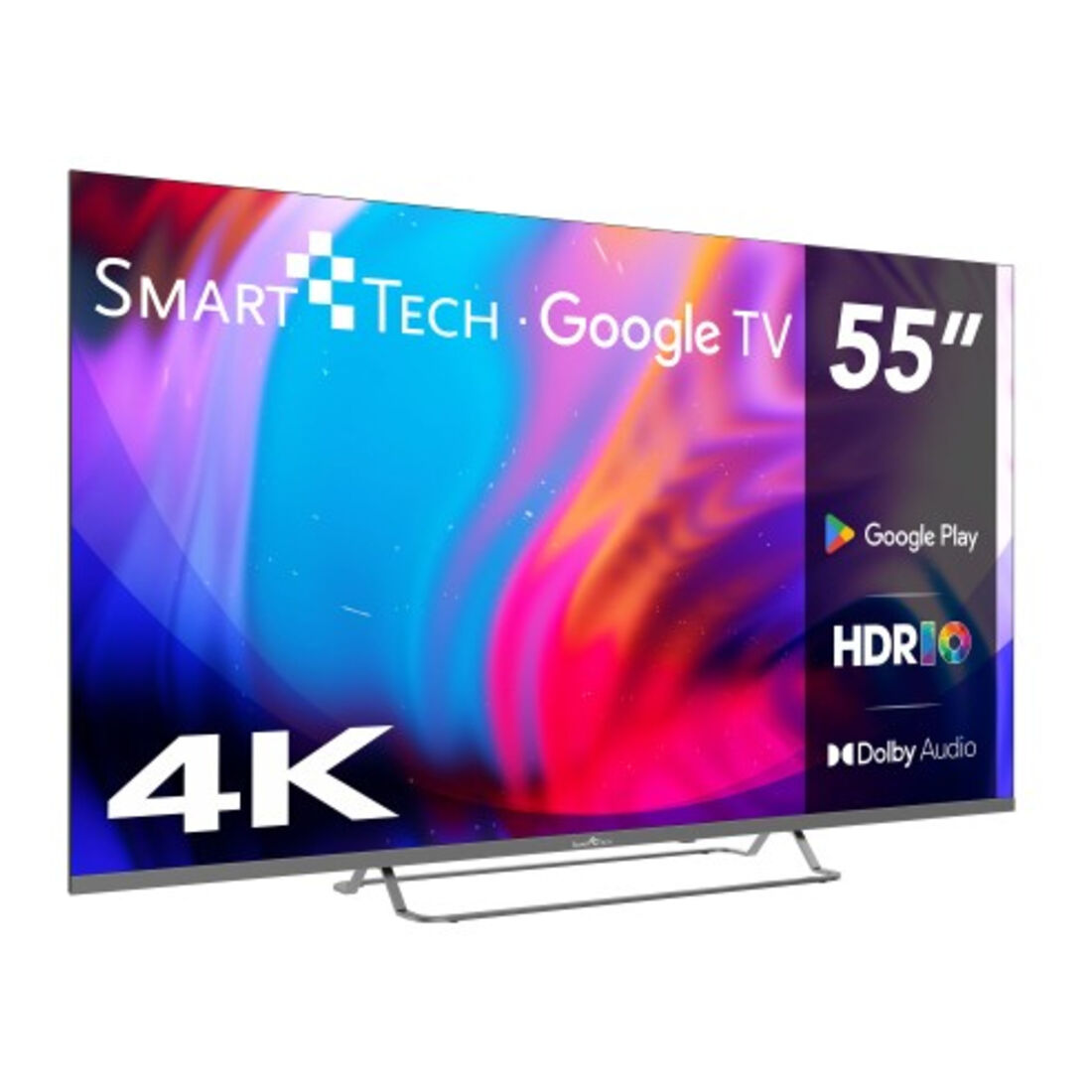 Smart-Tech 55UG02V. Dimensioni diagonale schermo: 139,7 cm (55″), Risoluzione del display: 3840 x 2160 Pixel, Tipologia HD: 4K Ultra HD, Tecnologia display: QLED, Forma dello schermo: Piatto, Tipo di retroilluminazione LED: Direct-LED. Smart TV. Luminosità schermo: 260 cd/m², Tempo di risposta: 8,5 ms, Rapporto di contrasto: 3000:1, Rapporto d’aspetto nativo: 16:9. Formato del segnale digitale: DVB-C, DVB-S, DVB-T, DVB-T2. Wi-Fi, Collegamento ethernet LAN. Colore del prodotto: Grigio