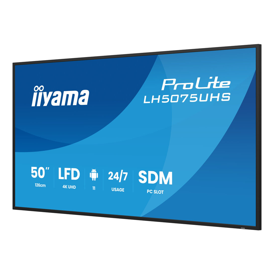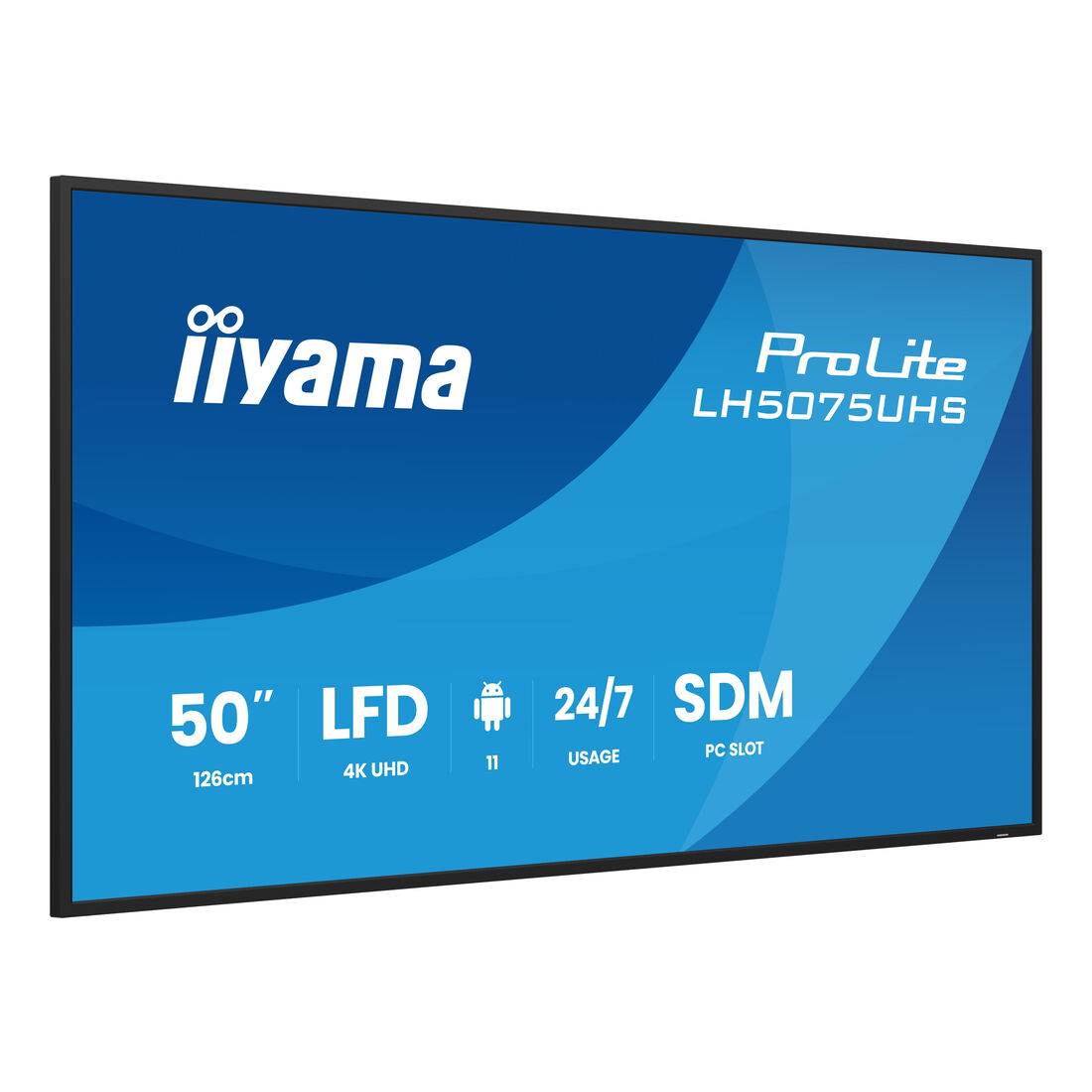 iiyama LH5075UHS-B2AG. Design del prodotto: Pannello piatto per segnaletica digitale. Dimensioni diagonale schermo: 125,7 cm (49.5″), Tecnologia display: LCD, Risoluzione del display: 3840 x 2160 Pixel, Luminosità schermo: 500 cd/m², Tipologia HD: 4K Ultra HD. Wi-Fi. Ore di servizio (ore/giorni): 24/7. Sistema operativo incluso: Android 11. Colore del prodotto: Nero