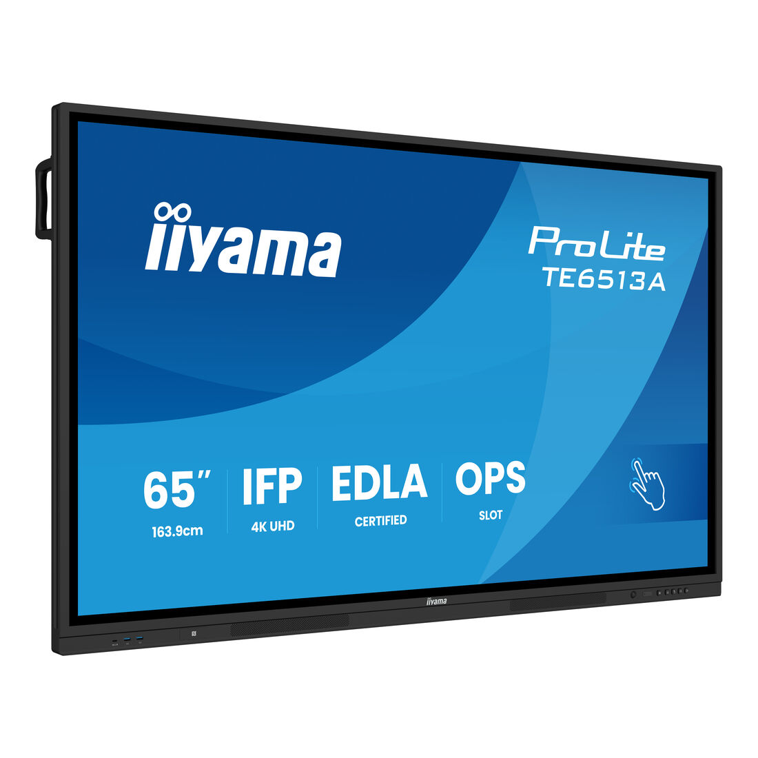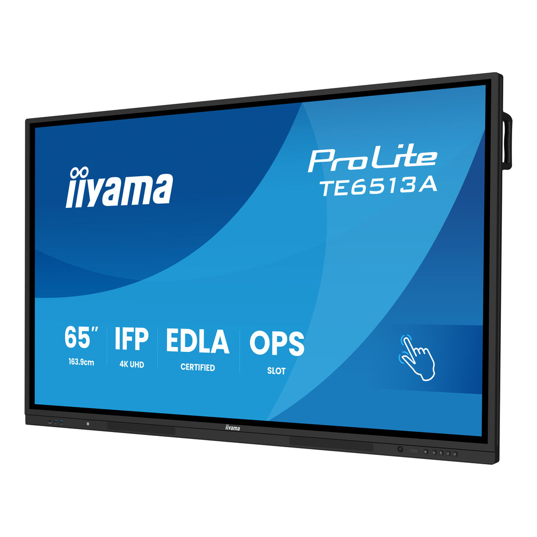 iiyama TE6513A-B1AG. Design del prodotto: Pannello piatto interattivo. Dimensioni diagonale schermo: 163,8 cm (64.5″), Risoluzione del display: 3840 x 2160 Pixel, Luminosità schermo: 500 cd/m², Tipologia HD: 4K Ultra HD, Touch screen. Wi-Fi. Ore di servizio (ore/giorni): 18/7. Sistema operativo incluso: Android. Colore del prodotto: Nero