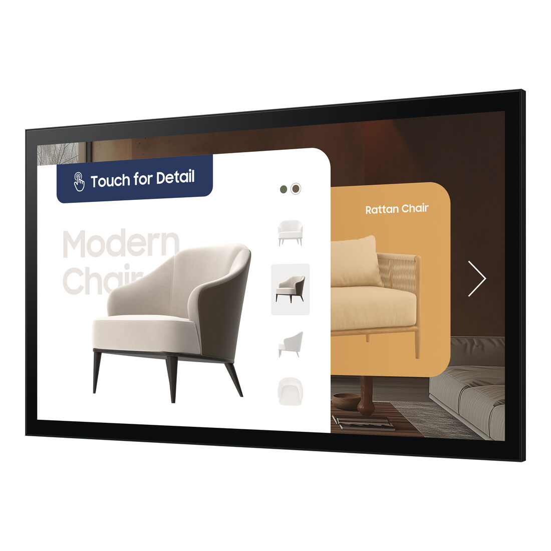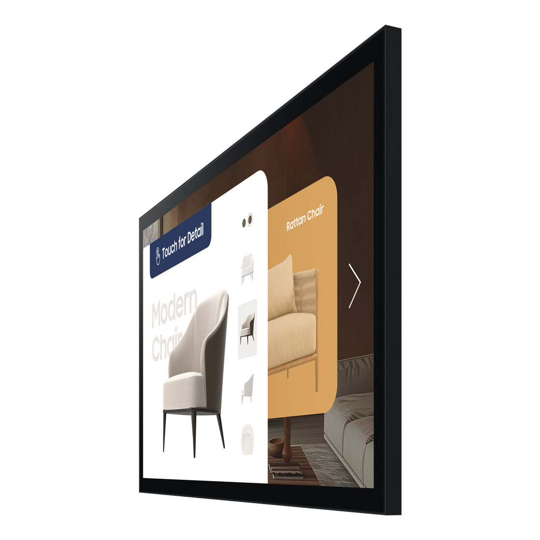 Samsung QM32C-T. Design del prodotto: Pannello piatto per segnaletica digitale. Dimensioni diagonale schermo: 81,3 cm (32″), Tecnologia display: LCD, Risoluzione del display: 1920 x 1080 Pixel, Luminosità schermo: 400 cd/m², Tipologia HD: Full HD, Touch screen. Wi-Fi. Ore di servizio (ore/giorni): 16/7. Sistema operativo incluso: Tizen 7.0. Colore del prodotto: Nero